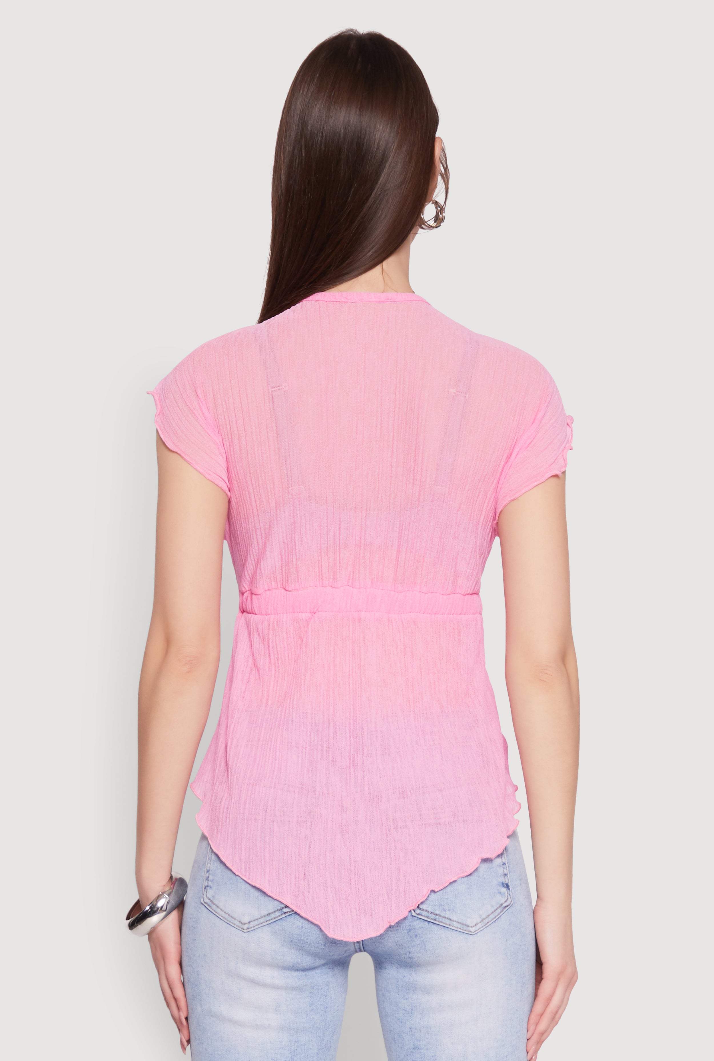 Upgrade your wardrobe with the V Neck Lettuce Edge Hanky Hem Blouse, a perfect blend of style and comfort that makes every day feel a little more special. Featuring a flattering V-neck and adorable flutter cap sleeves, this blouse offers a classic fit with a timeless silhouette. The textured knit fabric adds a touch of sophistication, while the decorative stitching, lettuce edge, and ruching details give it a playful yet polished look. Whether you're heading out with friends or dressing up for a casual date, this blouse is your new go-to for effortless chic.