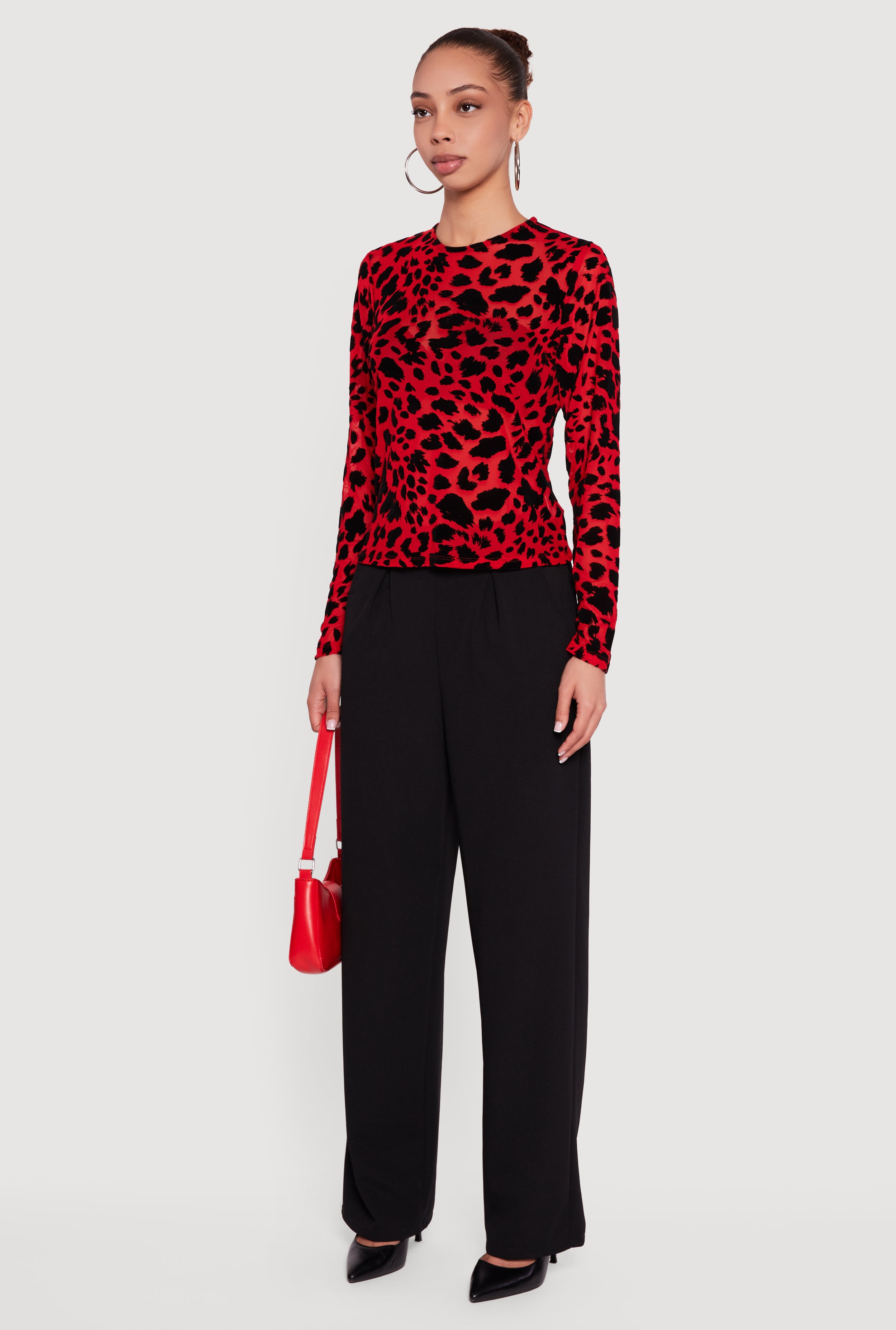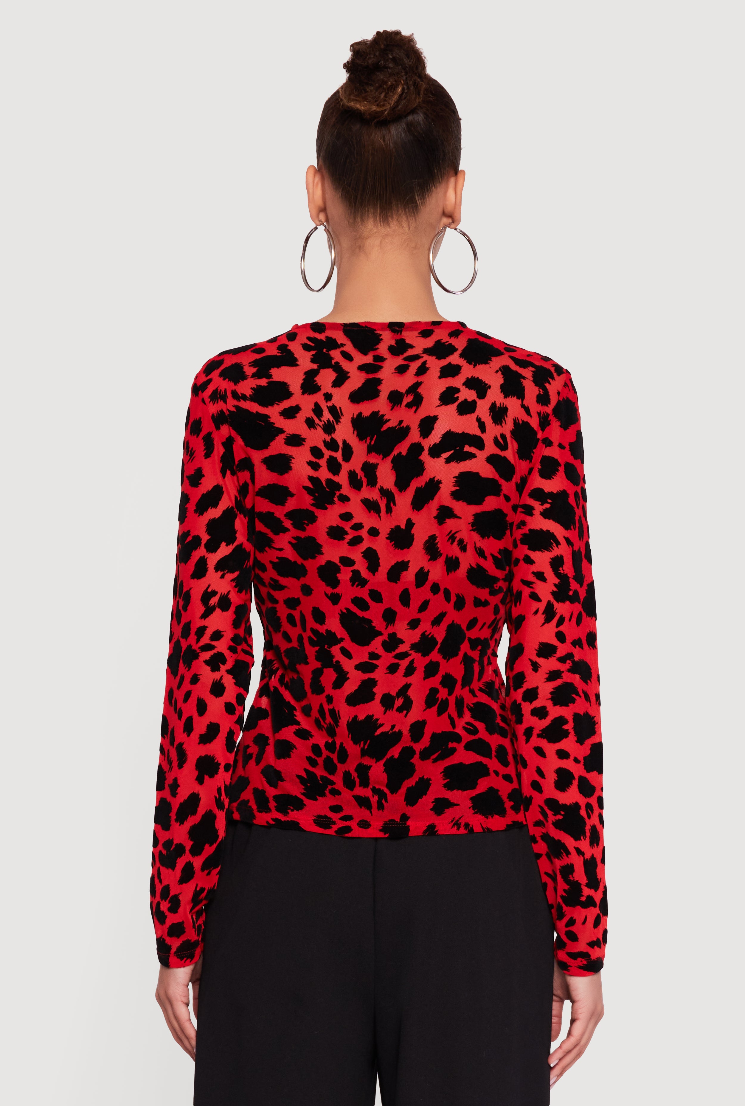 Step up your style game with this Animal Print Velvet Burnout Long Sleeve Top. Featuring a classic fit and crew neck, it blends edgy animal print with luxurious velvet burnout mesh for a look that's both bold and effortlessly cool. Perfect for casual days, nights out, or parties, this top is your new go-to for standing out without trying too hard. Pair it with your favorite jeans or a sleek skirt to turn heads wherever you go.