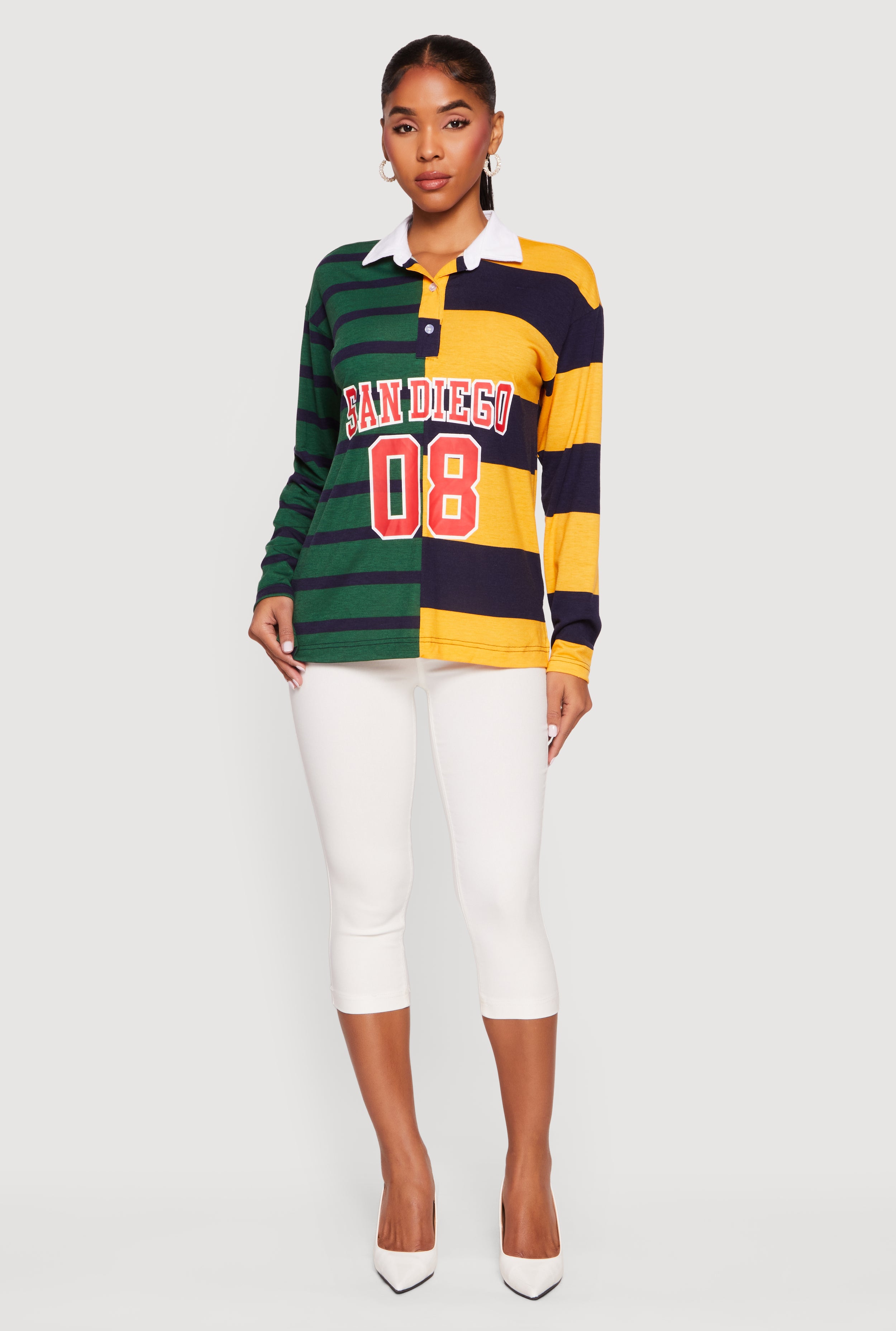 Step up your casual game with this Color Blocked Stripe Destination Graphic Polo Tee. Featuring a classic fit and long sleeves, this polo shirt brings a fresh twist to your everyday wardrobe with bold stripes and eye-catching color blocks. The button front and polo collar add a sporty vibe, while the drop shoulder design keeps it effortlessly cool. Perfect for laid-back days or weekend adventures, this tee is your new go-to for comfort and style.