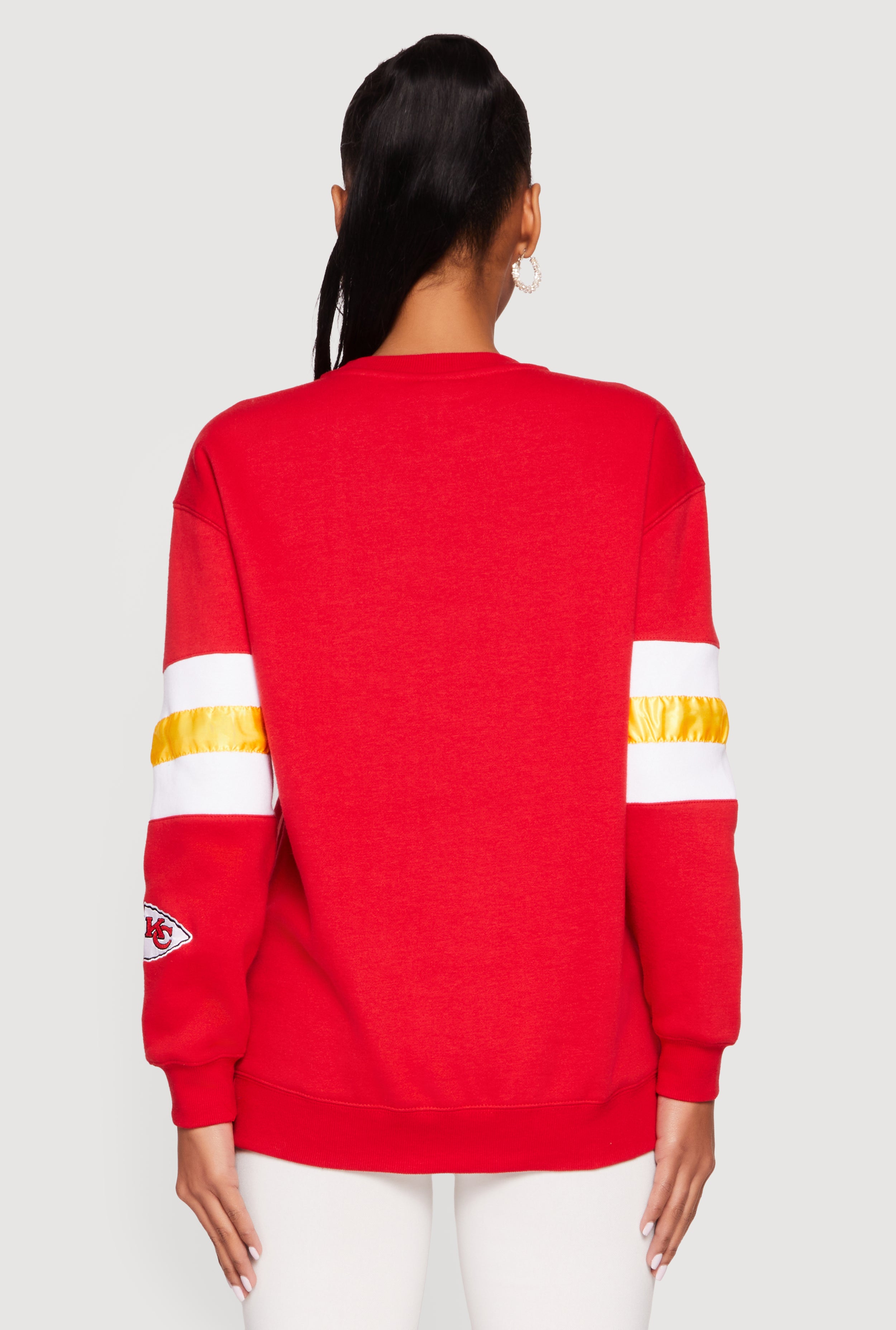 Show off your team spirit in style with the NFL Chiefs Embroidered Crew Neck Sweatshirt. This cozy fleece pullover combines classic fit comfort with standout details like satin accents and varsity stripe patches for a sporty, chic look. Perfect for casual days or athleisure vibes, it’s designed to keep you warm while turning heads at every game or hangout.