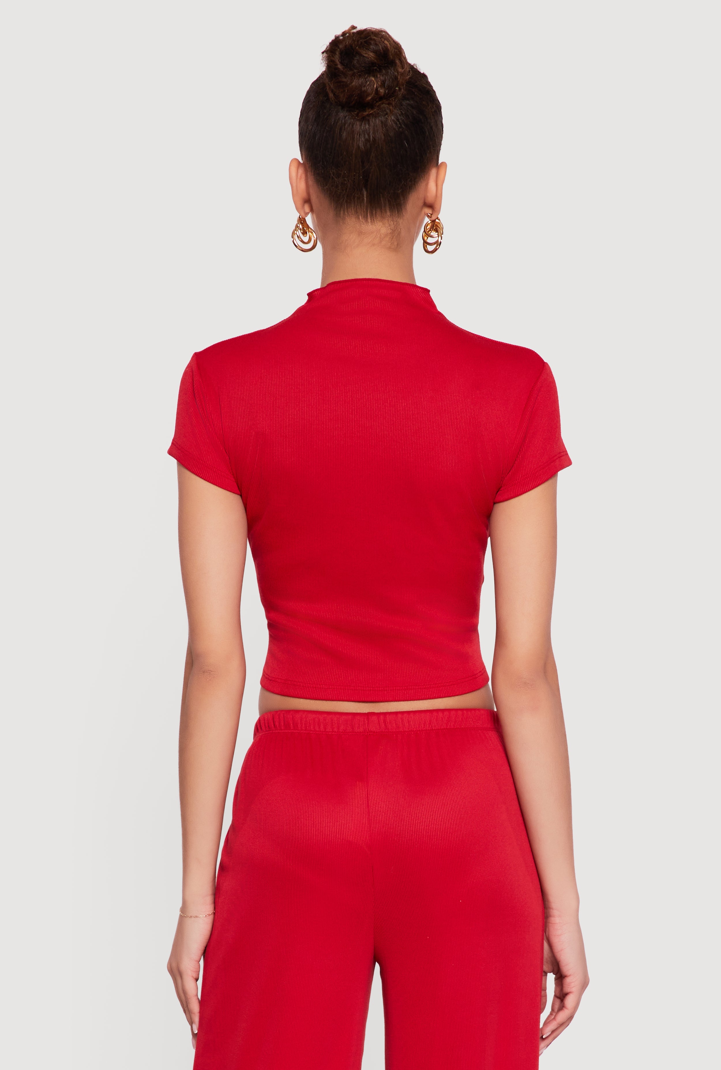 This crop top features a mock neck that adds a modern edge, paired with short sleeves for easy layering. The ribbed knit fabric provides subtle texture, while the ruched detailing creates a flattering silhouette. Its classic fit offers a timeless shape that works well with casual looks.