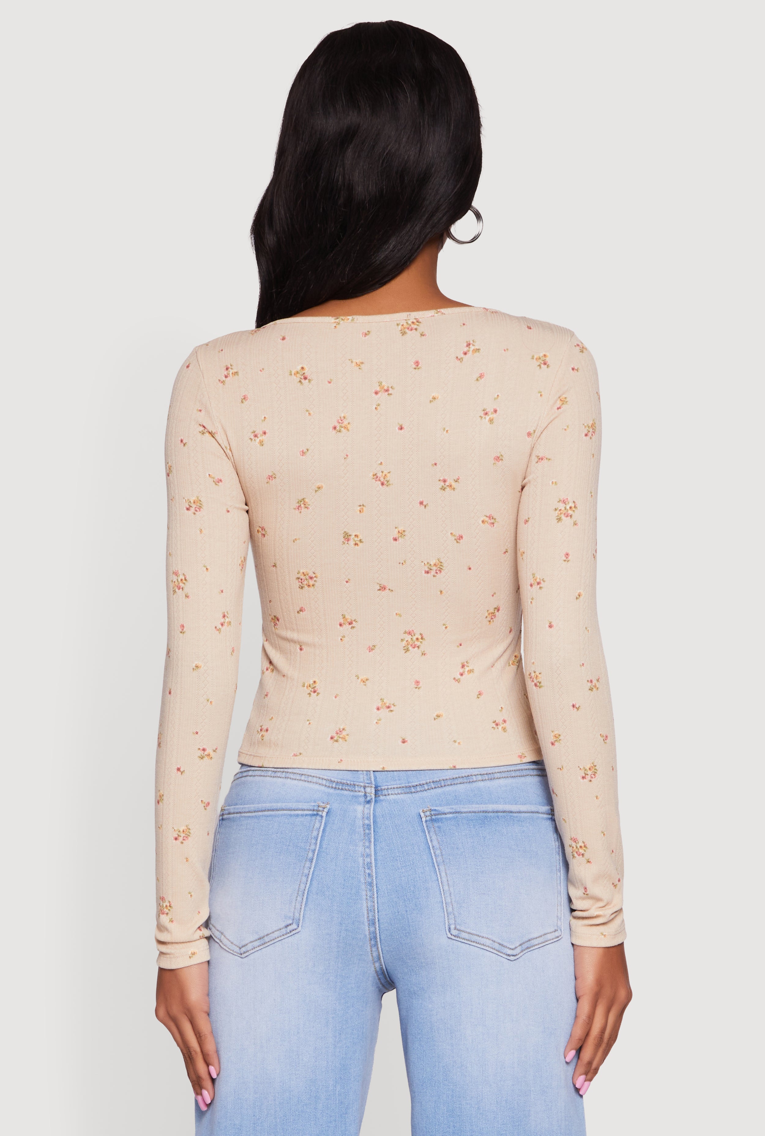 Step into effortless style with the Floral Pointelle Long Sleeve Crop Top by Ambiance. This classic fit crop top features a delicate pointelle knit that adds a touch of feminine charm to your everyday look. The square neckline and long sleeves create a flattering silhouette that’s perfect for layering or wearing on its own. Finished with a sweet bow embellishment, this textured knit top is your new go-to for casual days or weekend hangouts.