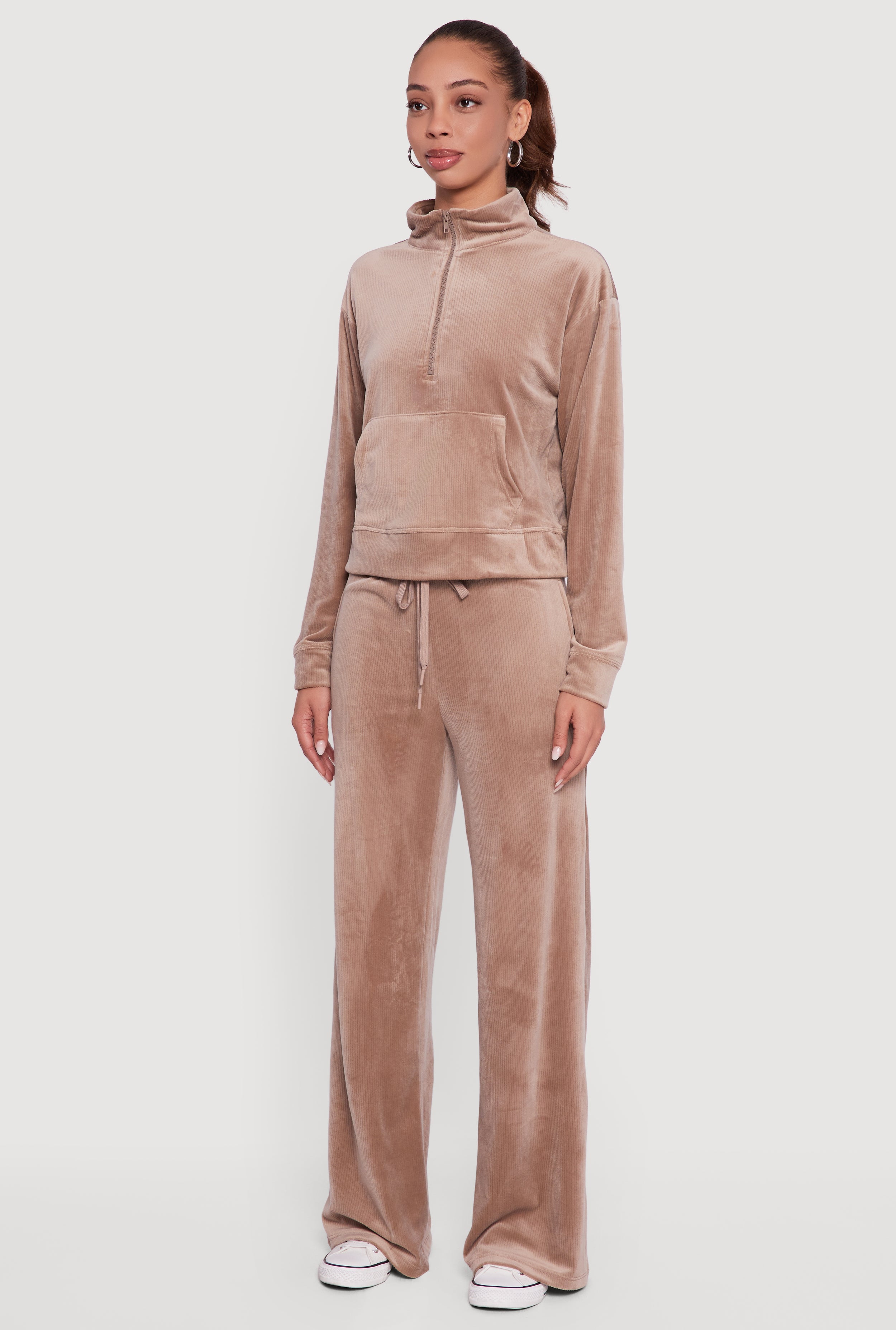 Cozy up in the Ribbed Velour Half Zip Mock Neck Pullover, your new go-to for effortless style and comfort. This pullover features a plush velour fabric with a subtle ribbed texture that adds a touch of luxe to your casual wardrobe. The half zip front and mock neck let you customize your look and warmth, while the kangaroo pocket keeps your hands toasty and essentials close. Perfect for chill days or athleisure vibes, this classic fit piece blends softness and style in one easy layer.
