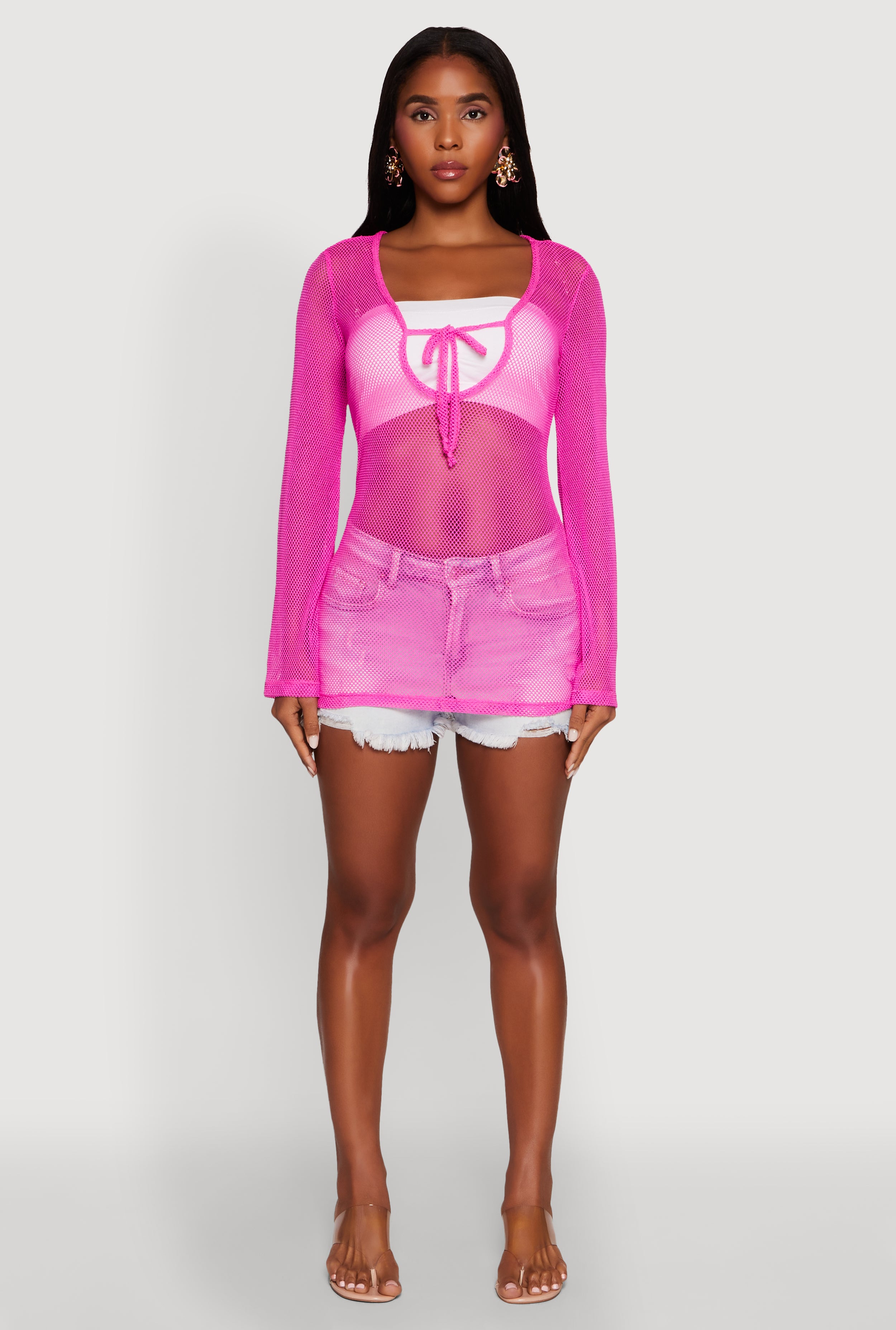 Fishnet Tie Front Keyhole Long Sleeve Top