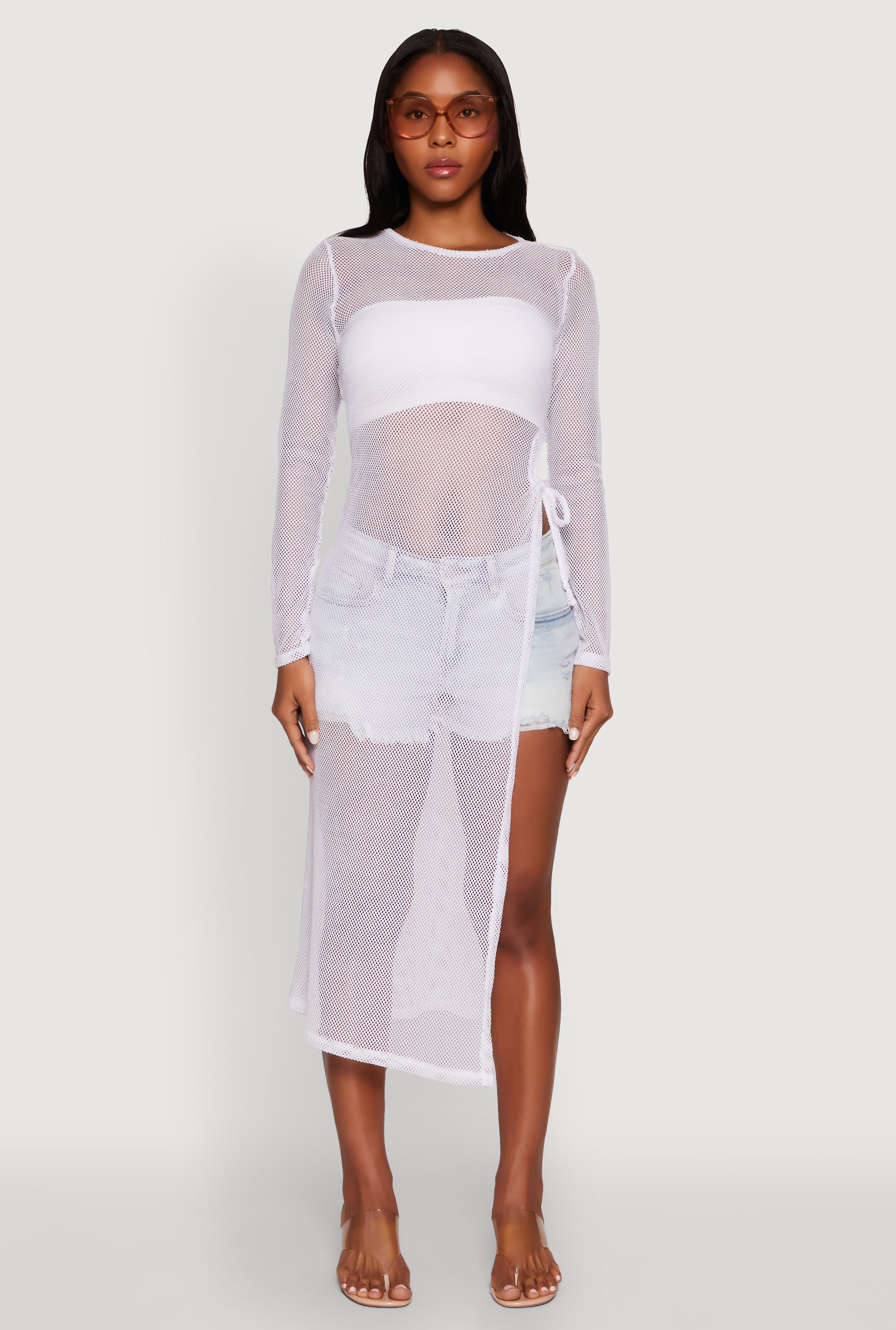 Fishnet Drawstring Keyhole Side Slit Maxi Top