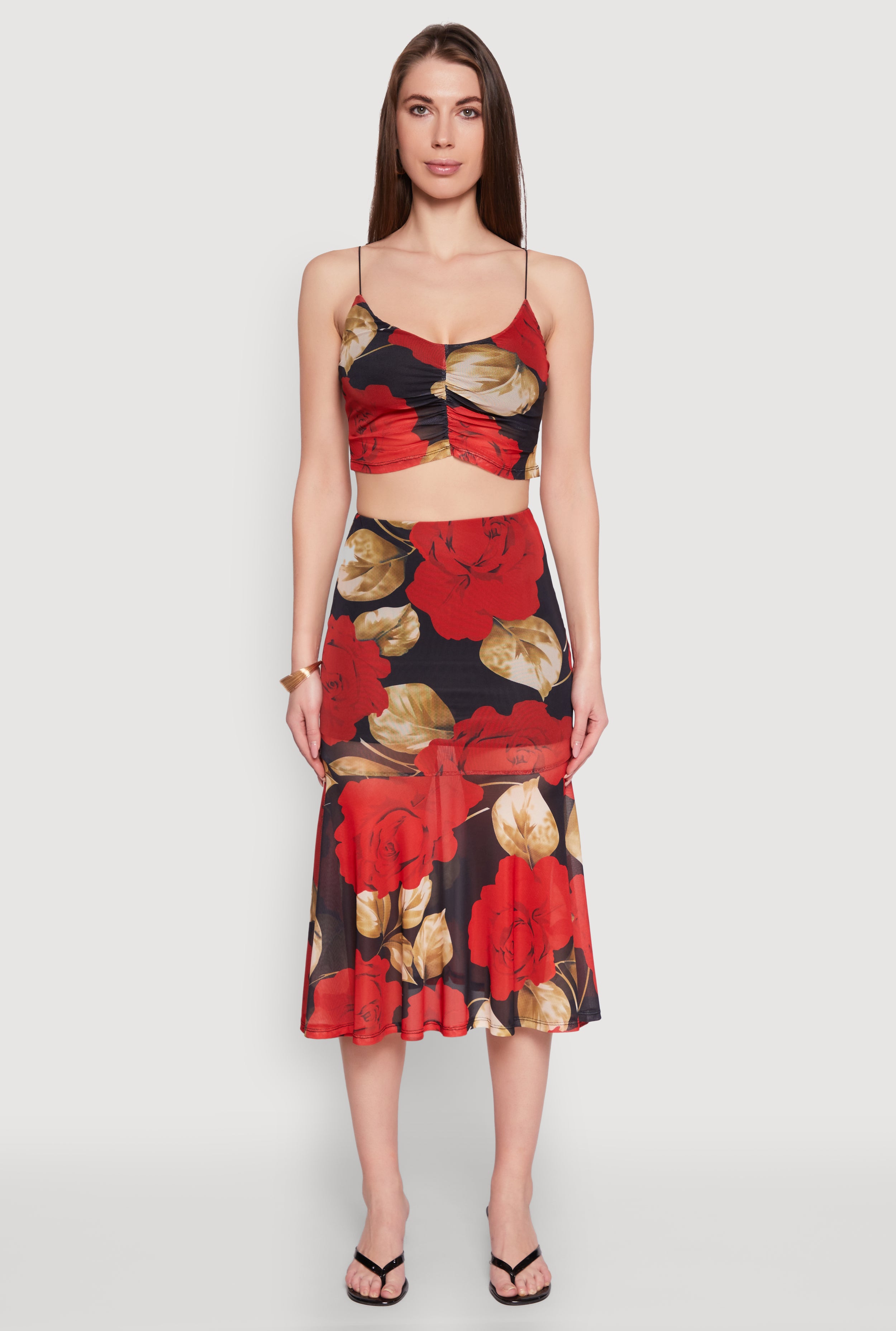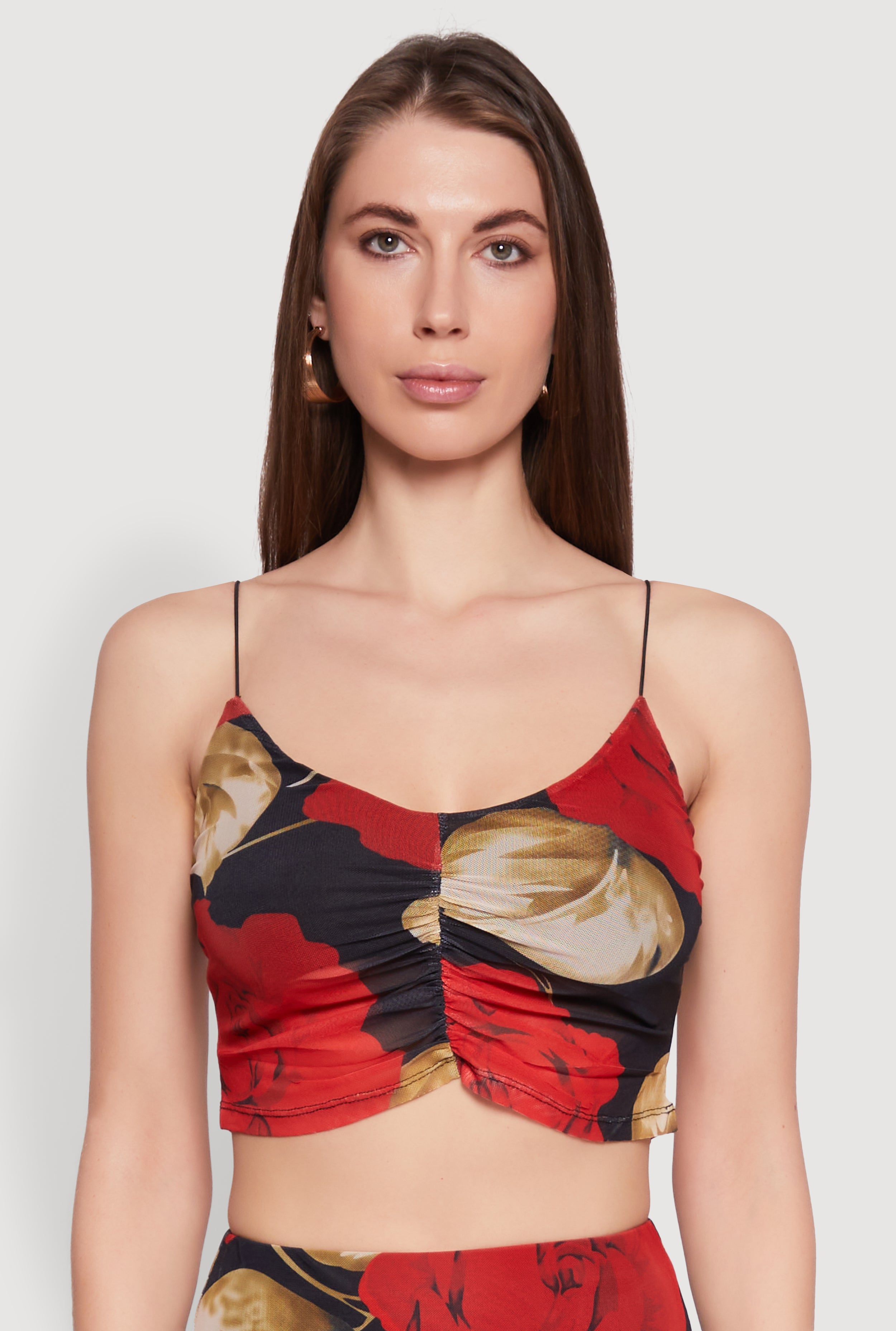 Mesh Rose Print Ruched Crop Top