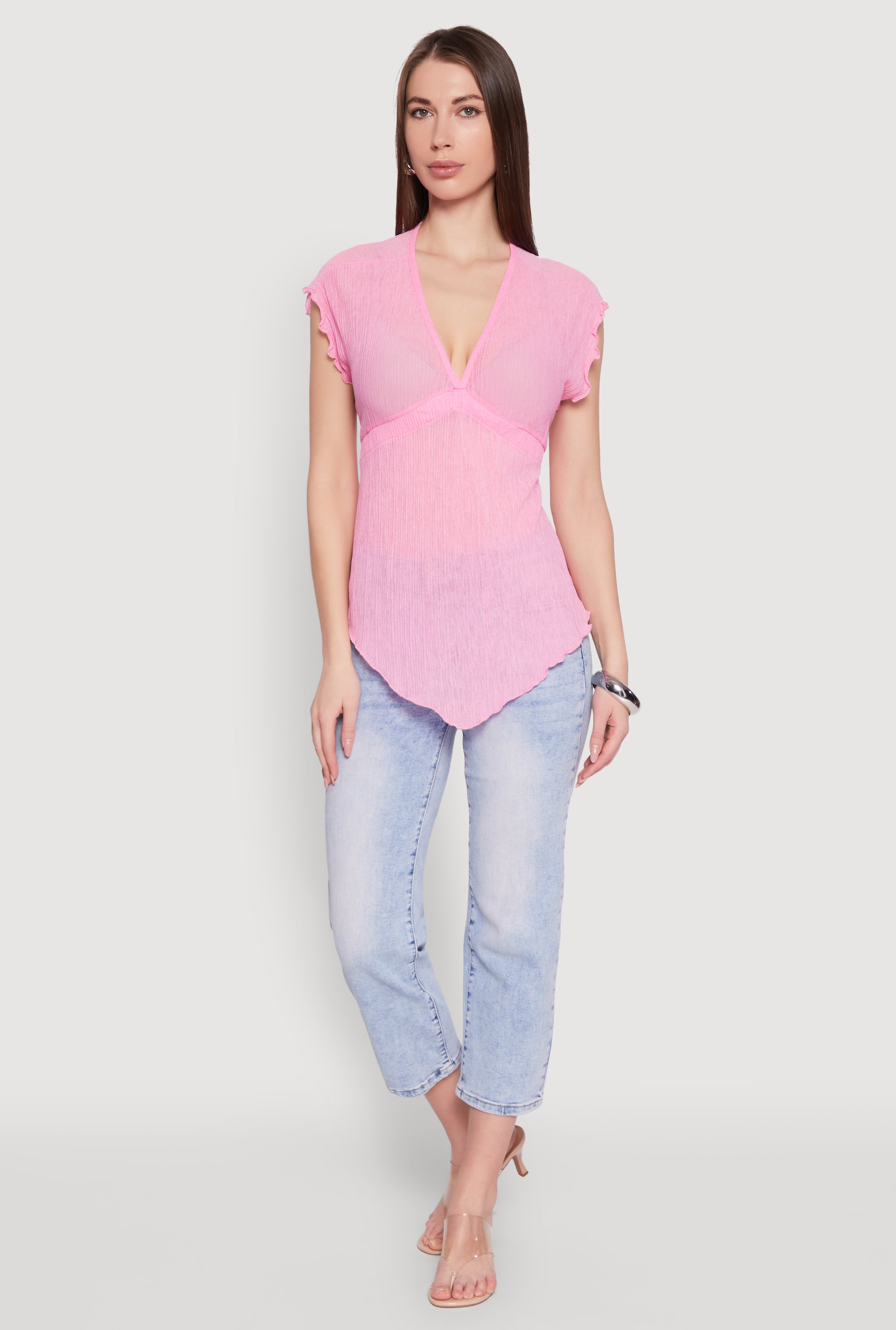 V Neck Lettuce Edge Hanky Hem Blouse