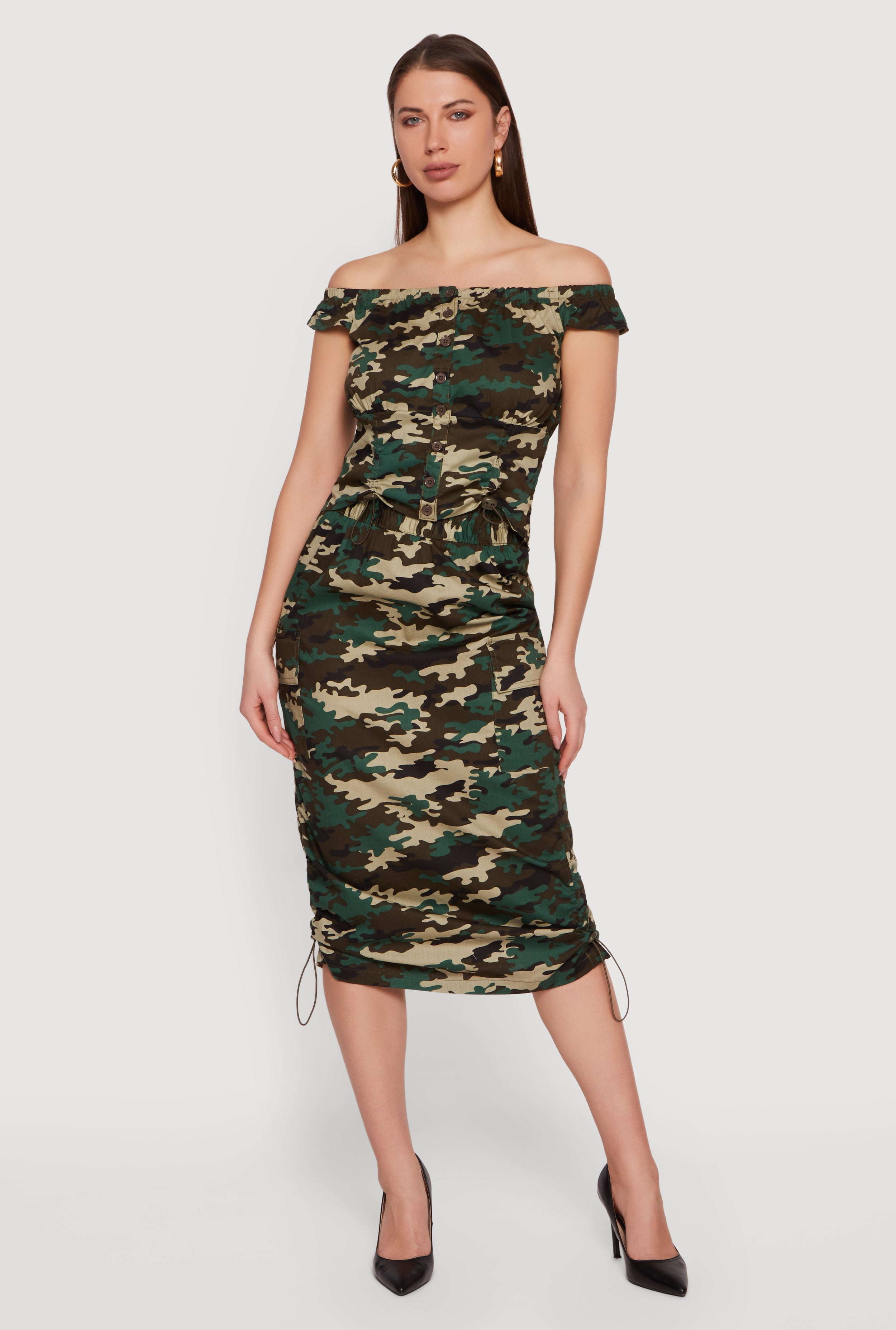 Camo Off The Shoulder Button Front Blouse