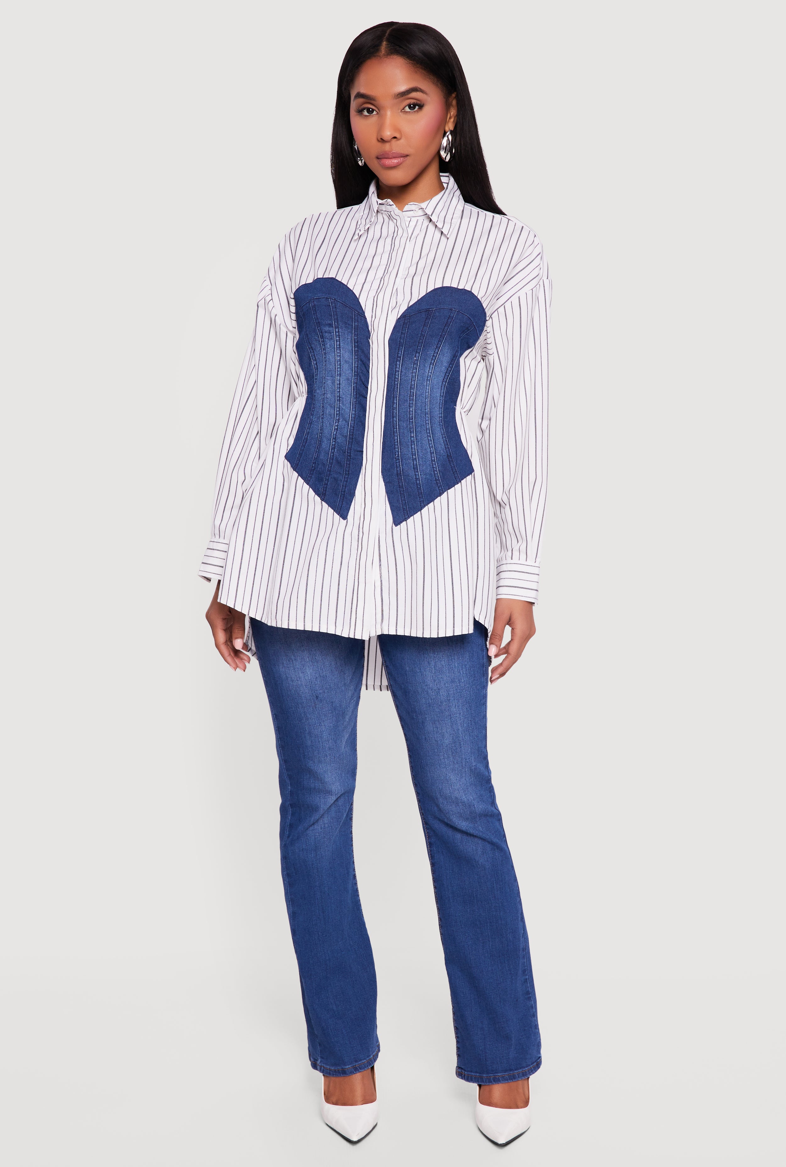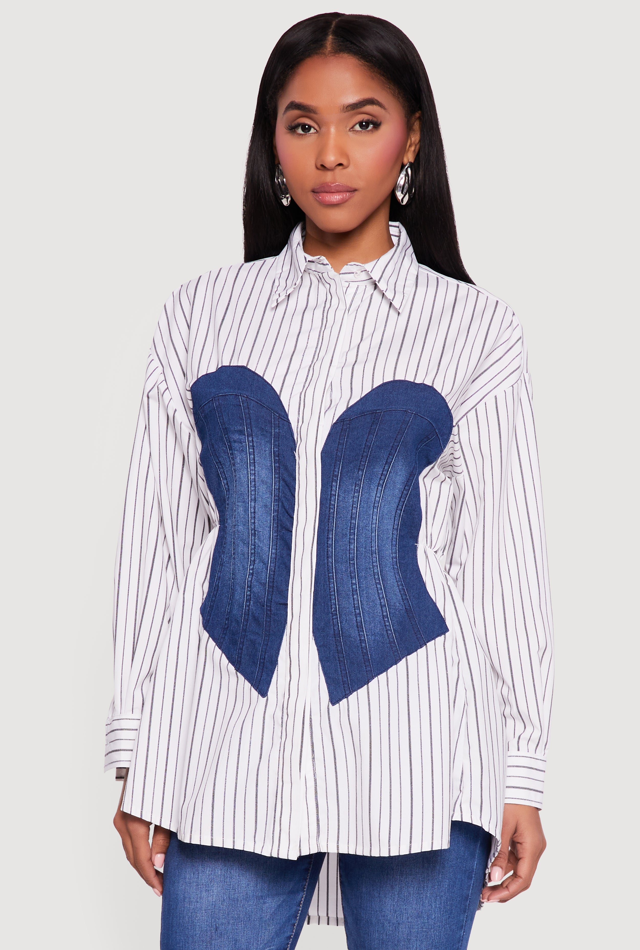 Denim Corset Detail Button Down Long Sleeve Blouse