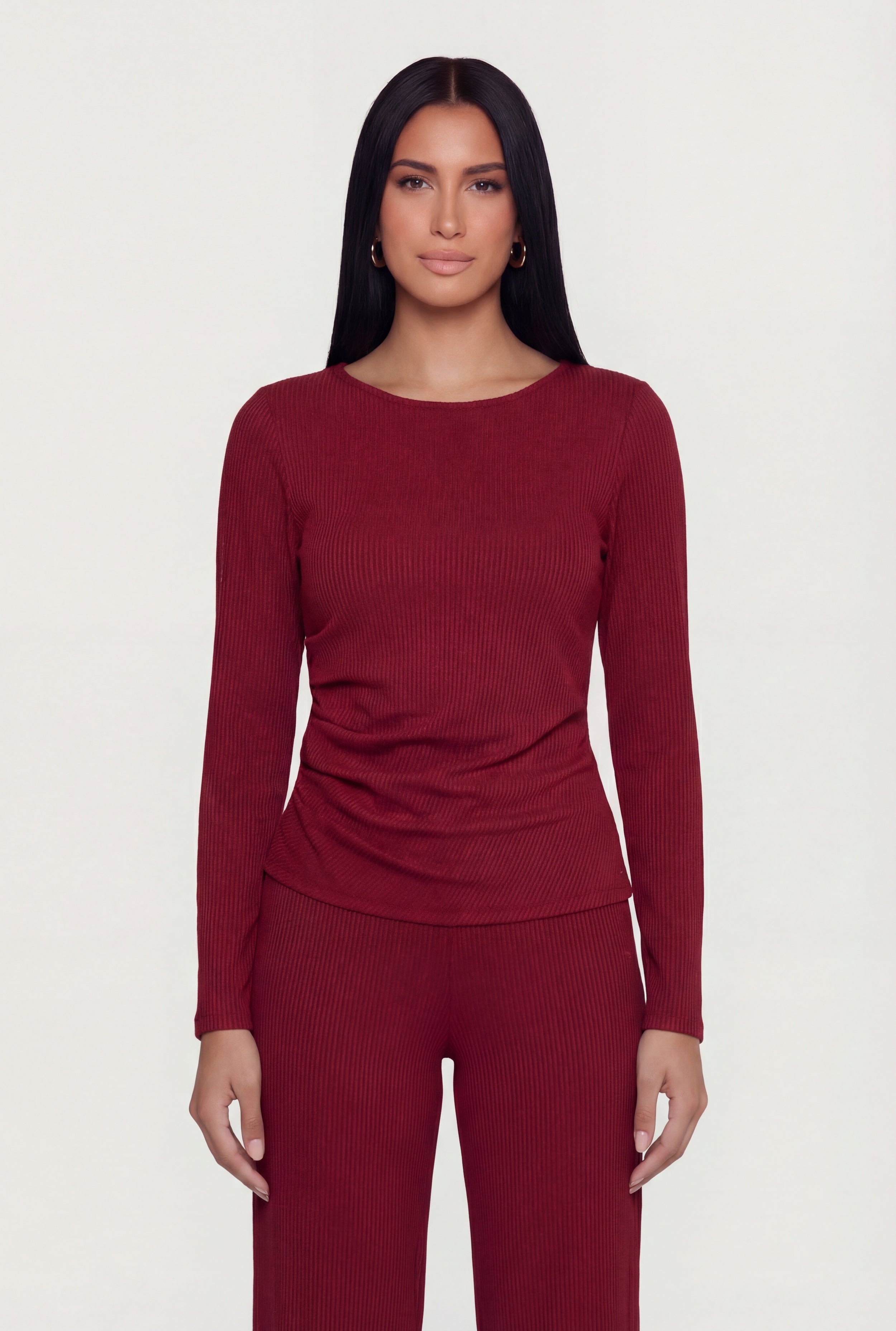 Ribbed Knit Side Ruched Long Sleeve Blouse