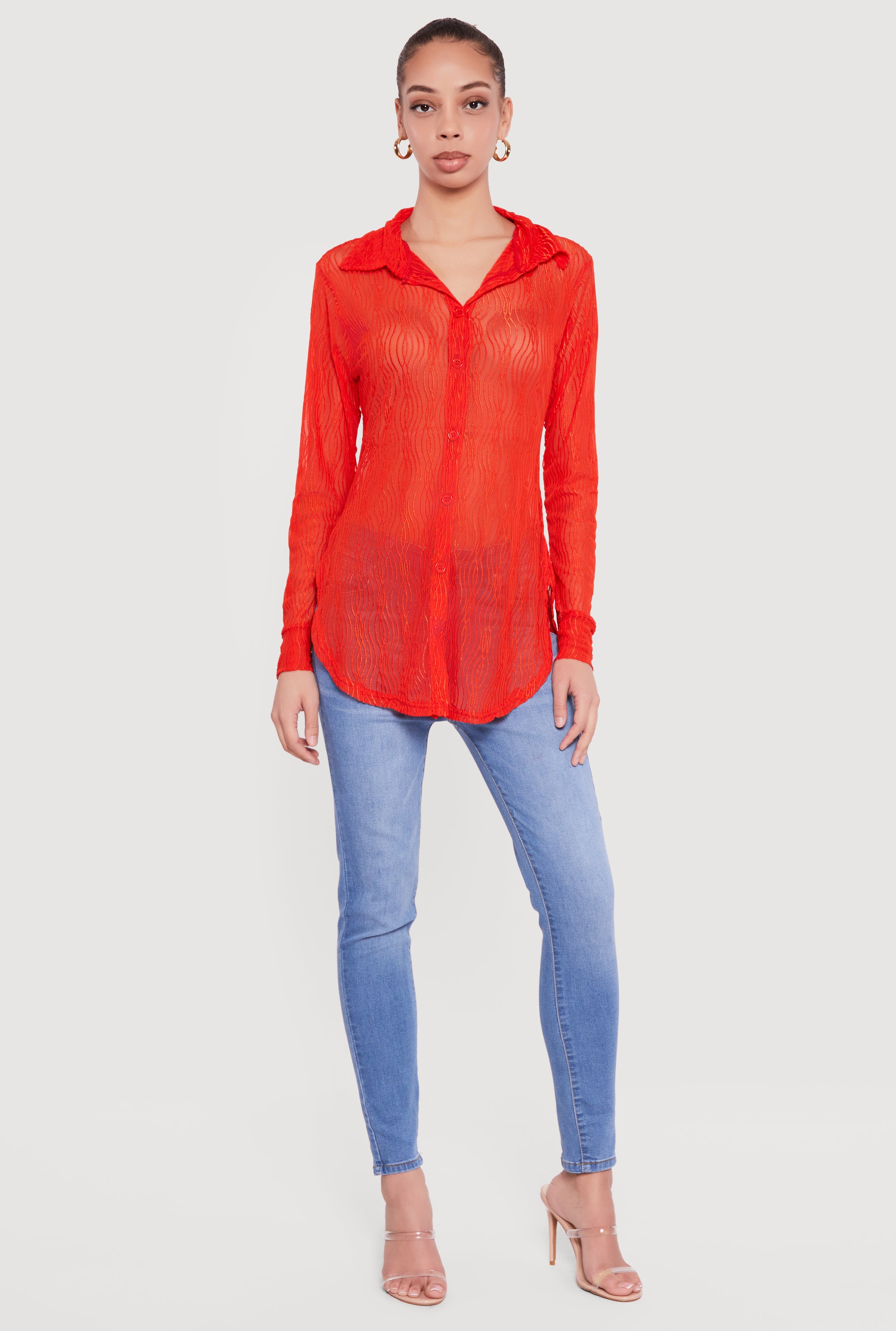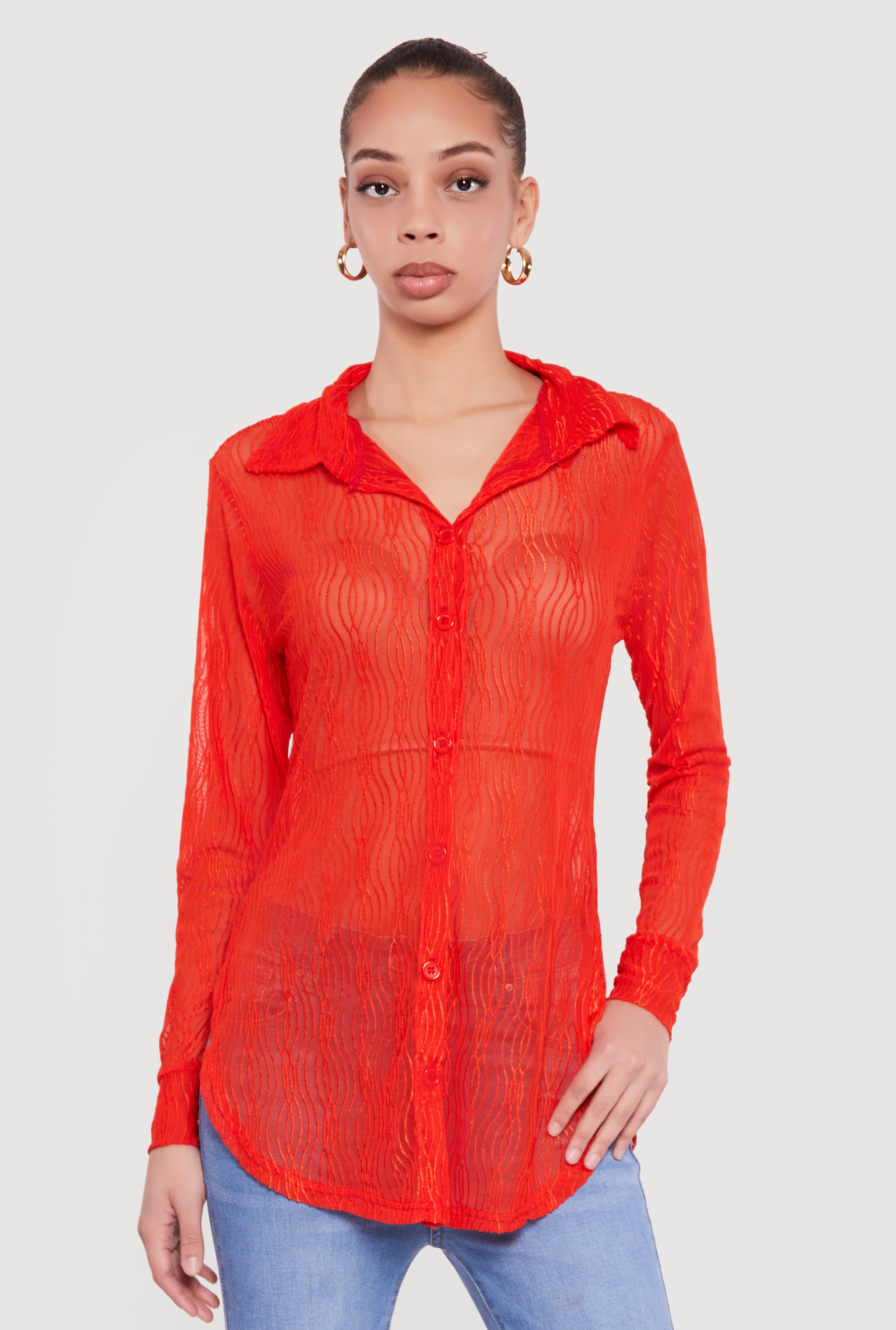 Swirl Mesh Button Front Tunic Shirt