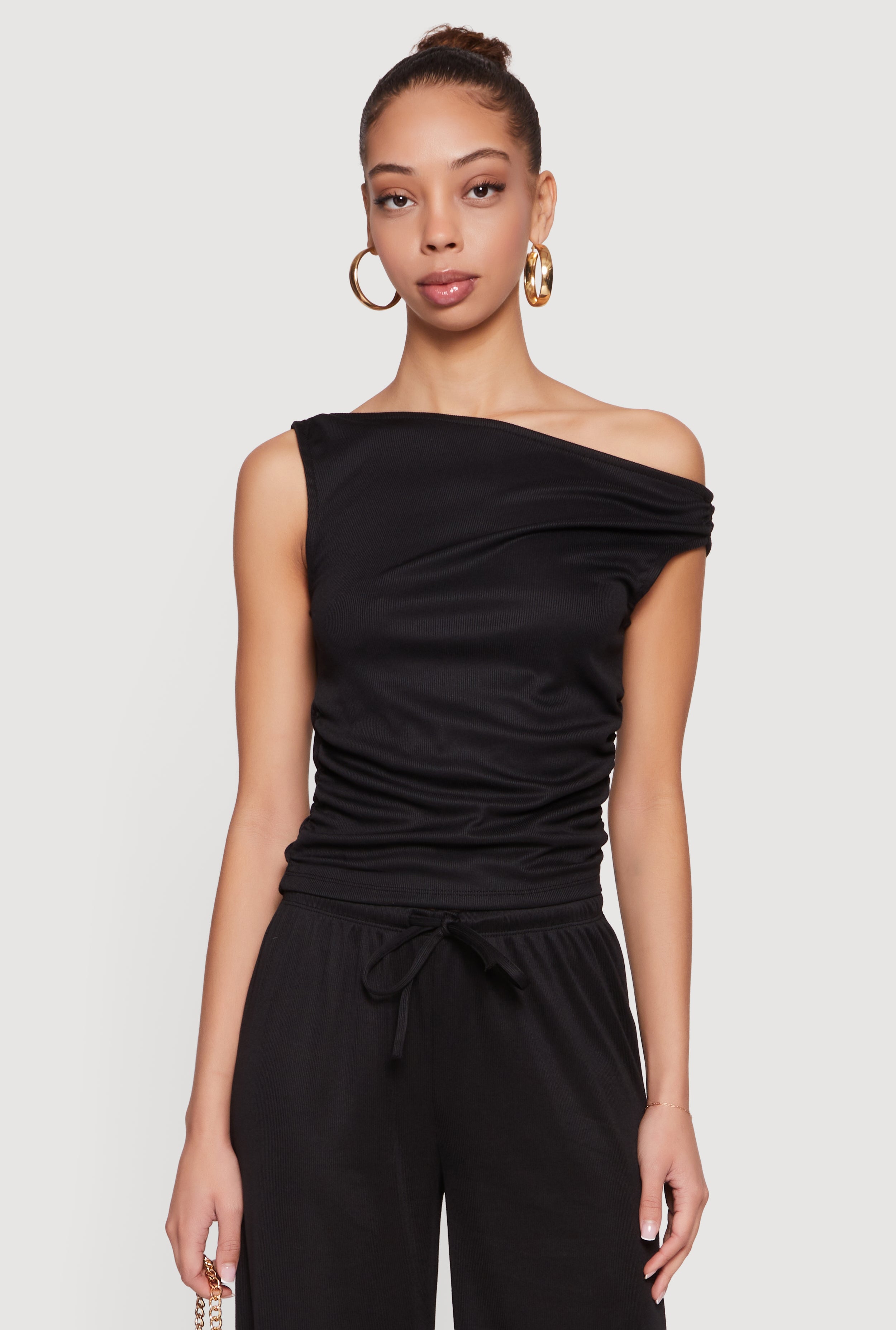 Side Ruched One Shoulder Ribbed Knit Blouse