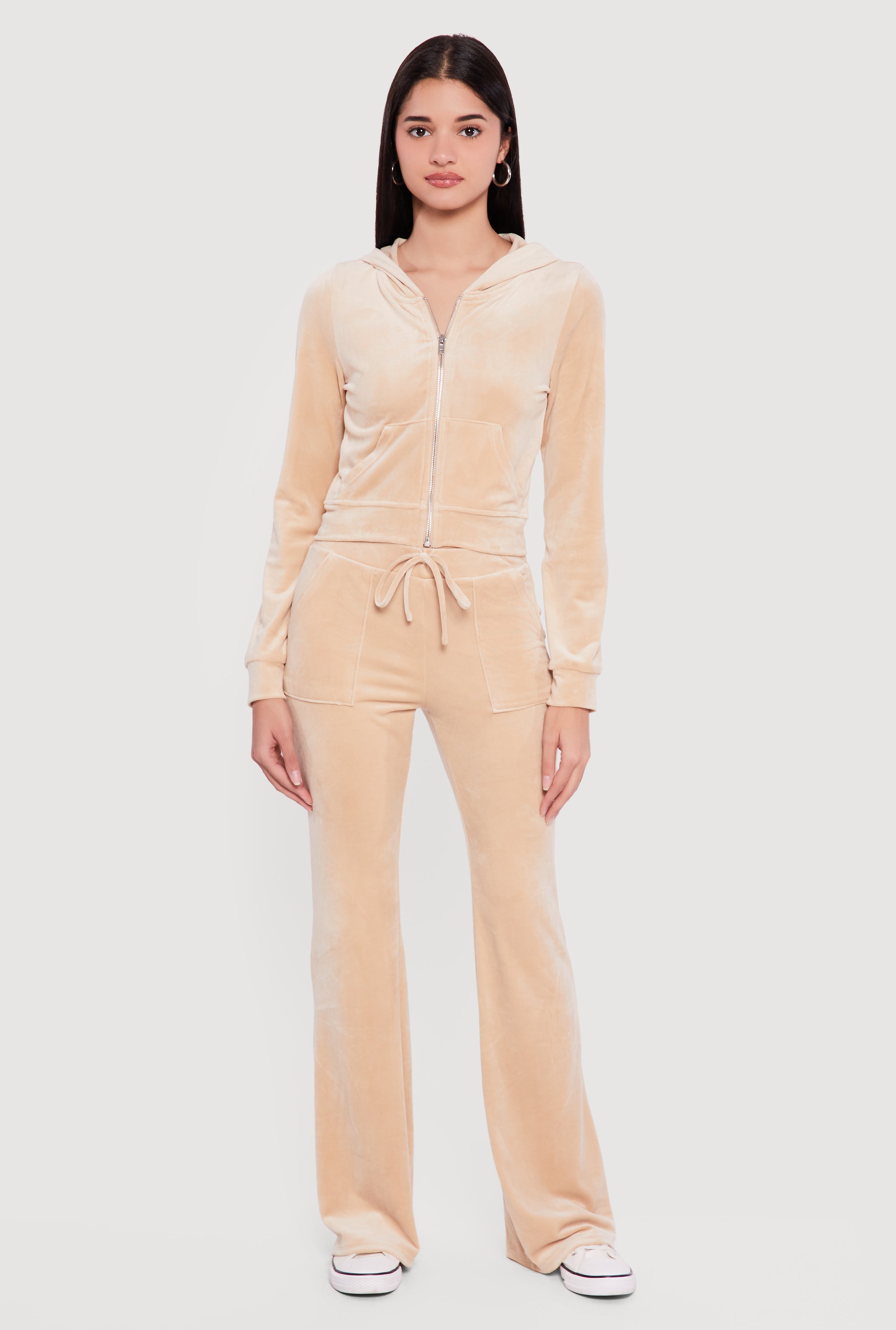 Velour Zip Front Long Sleeve Hoodie