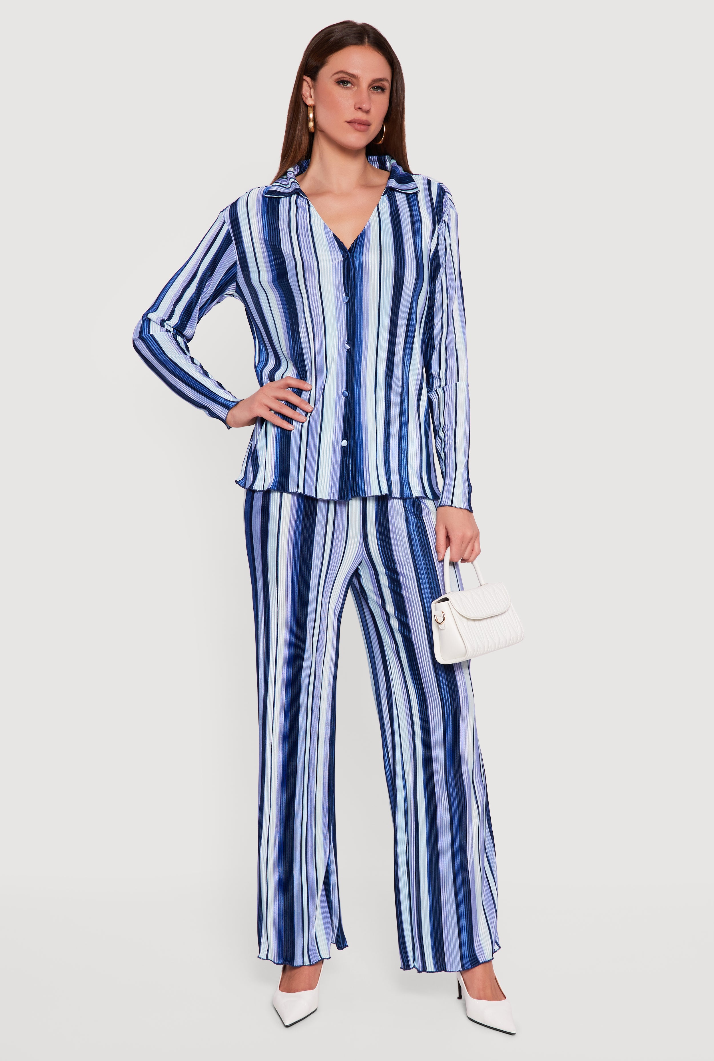 Collared Long Sleeve Striped Plisse Blouse