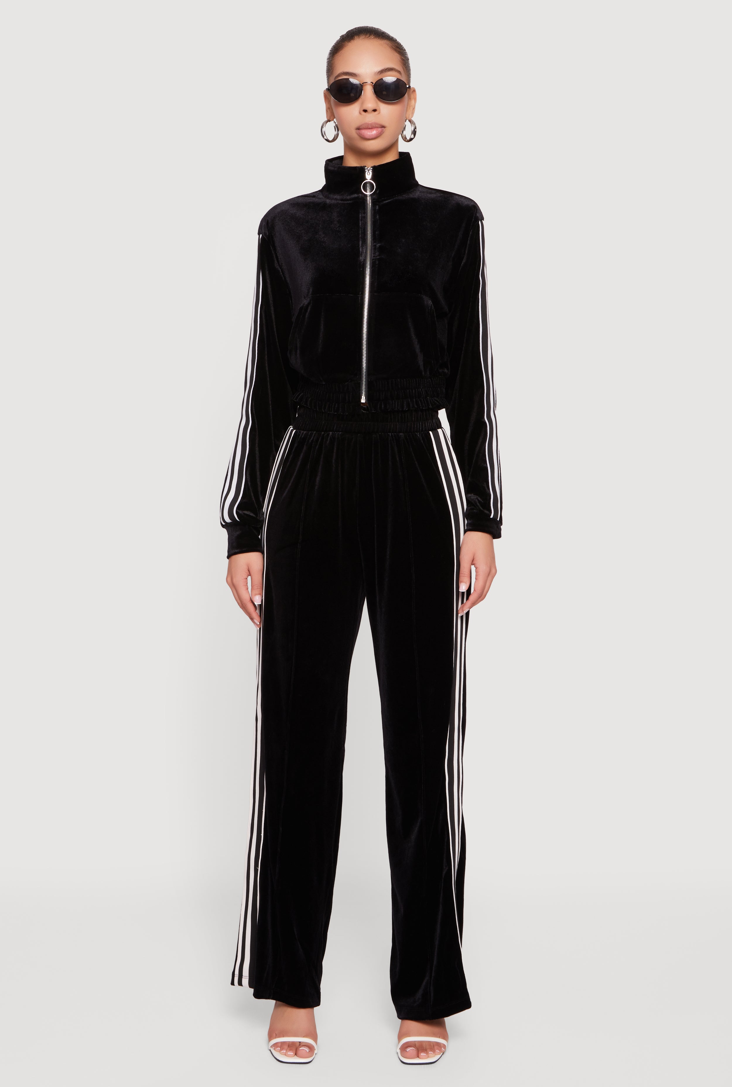 Velour Side Stripe Mock Neck Zip Front Top
