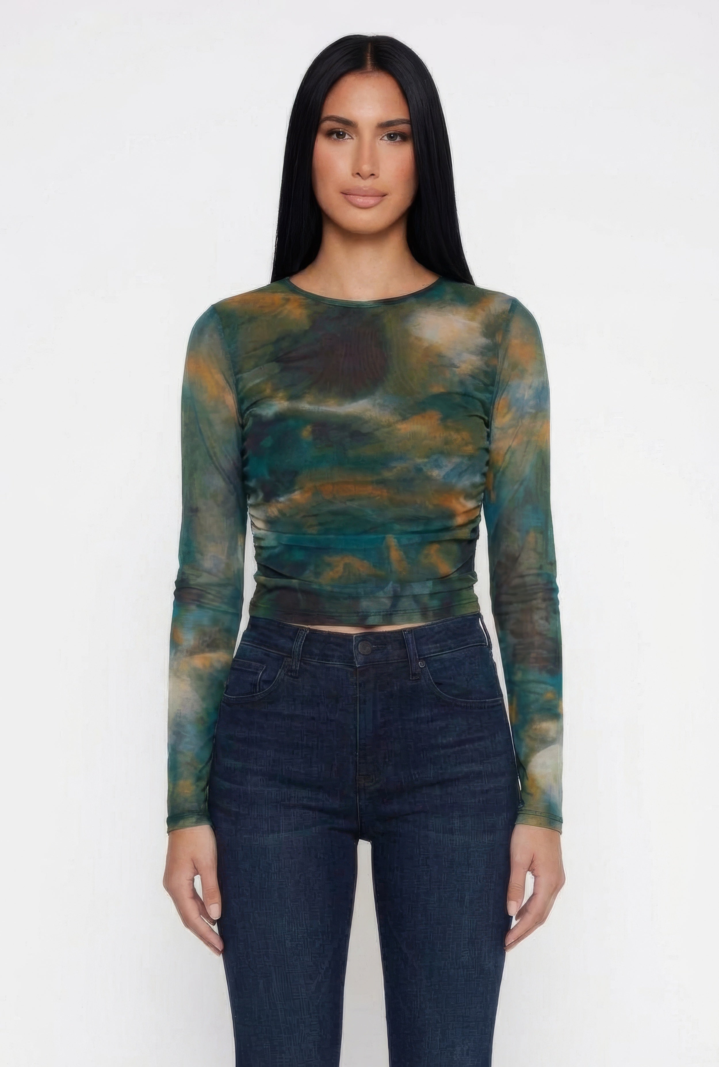 Printed Pattern Ruched Mesh Overlay Crop Top