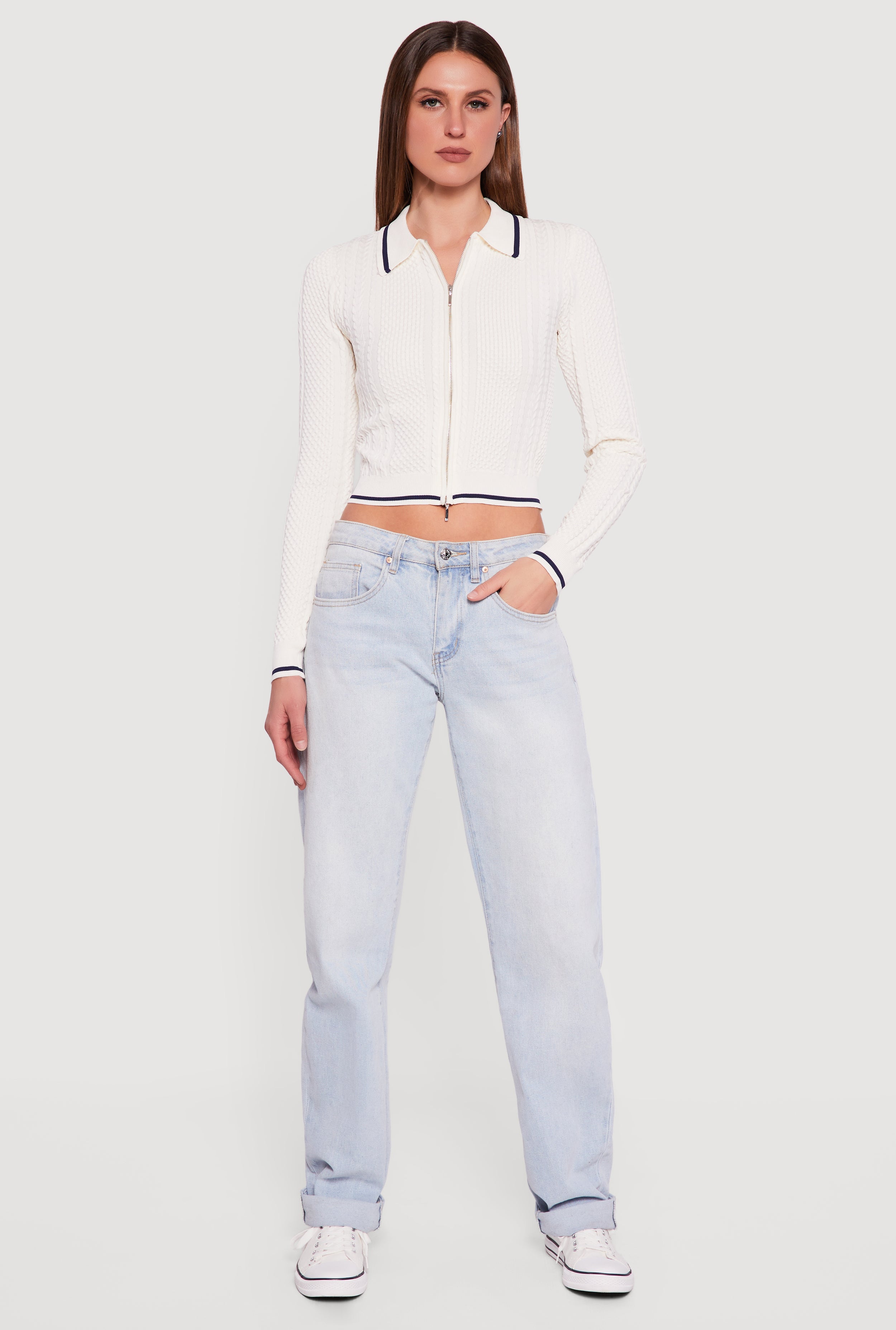 Contrast Trim Zip Front Textured Knit Sweater