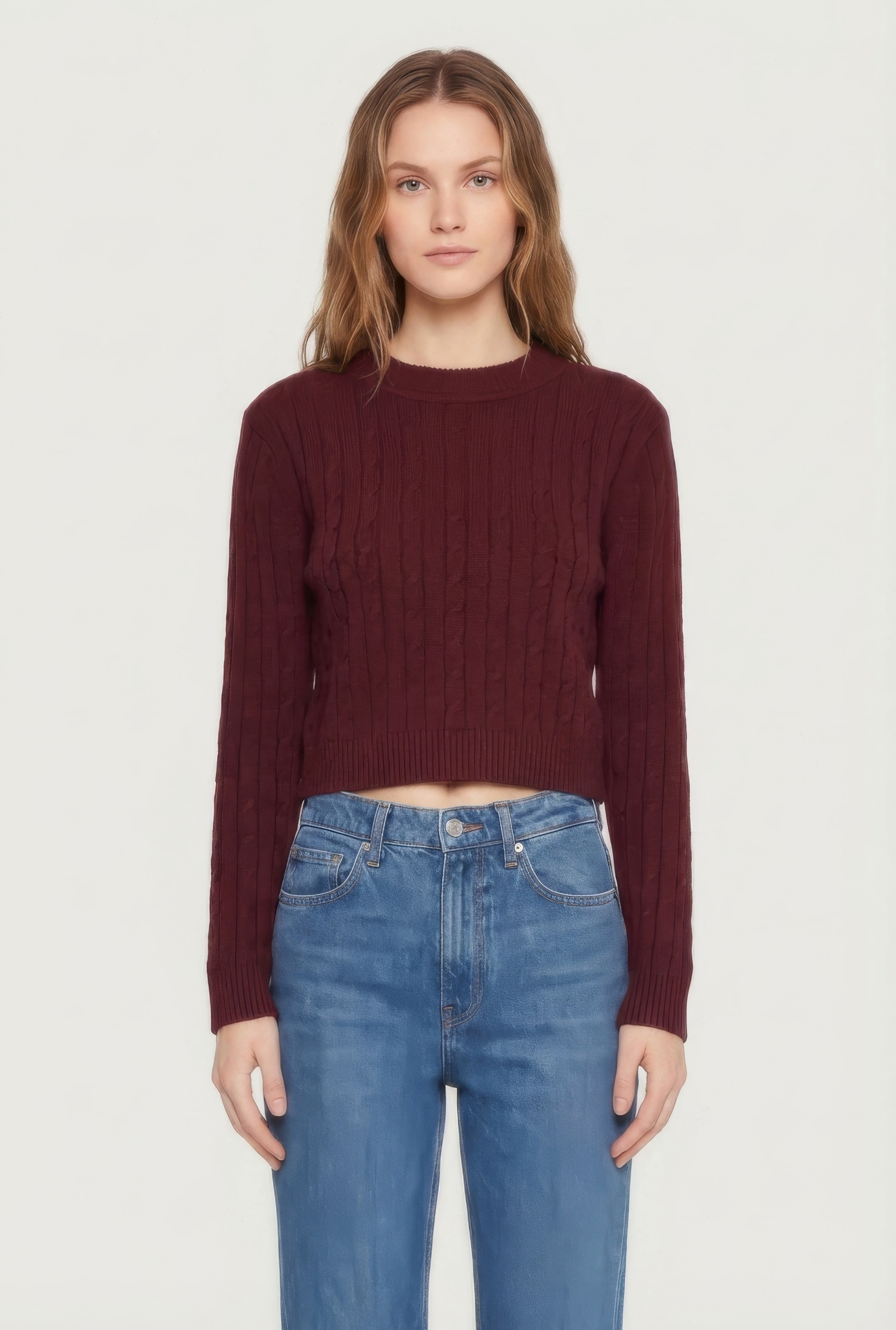 Cable Knit Mock Neck Long Sleeve Cropped Sweater