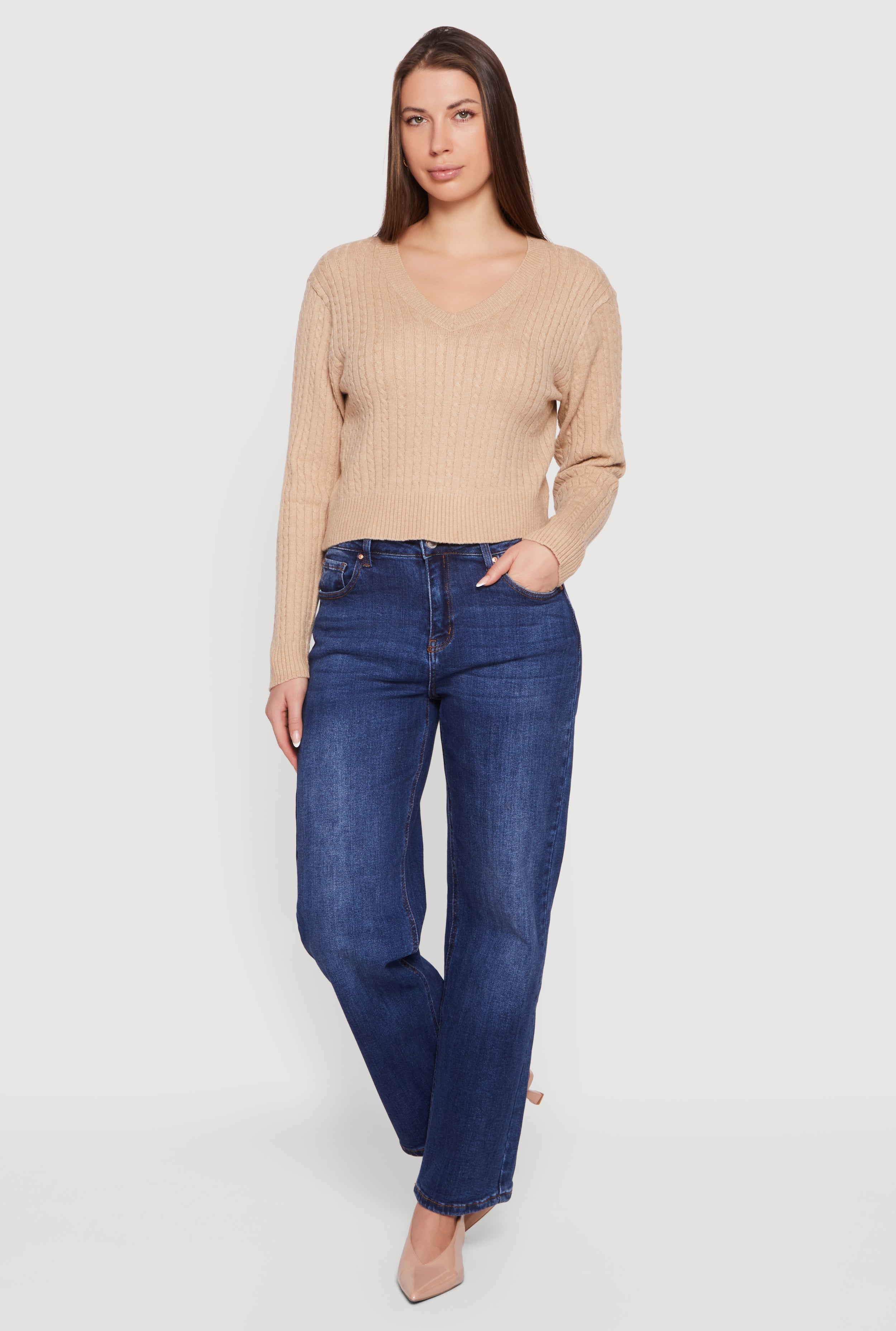 Cable Knit V-Neck Long Sleeve Cropped Sweater