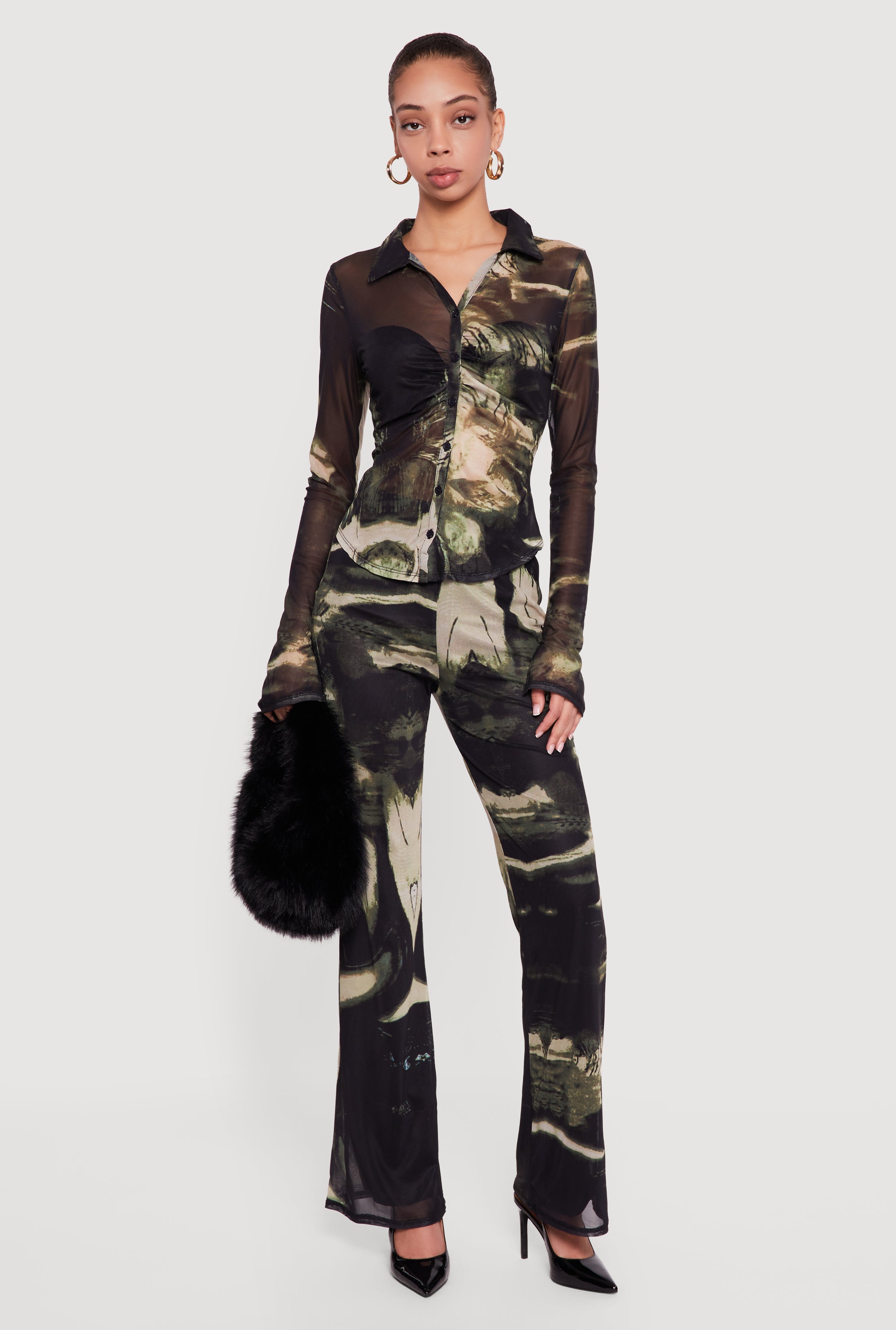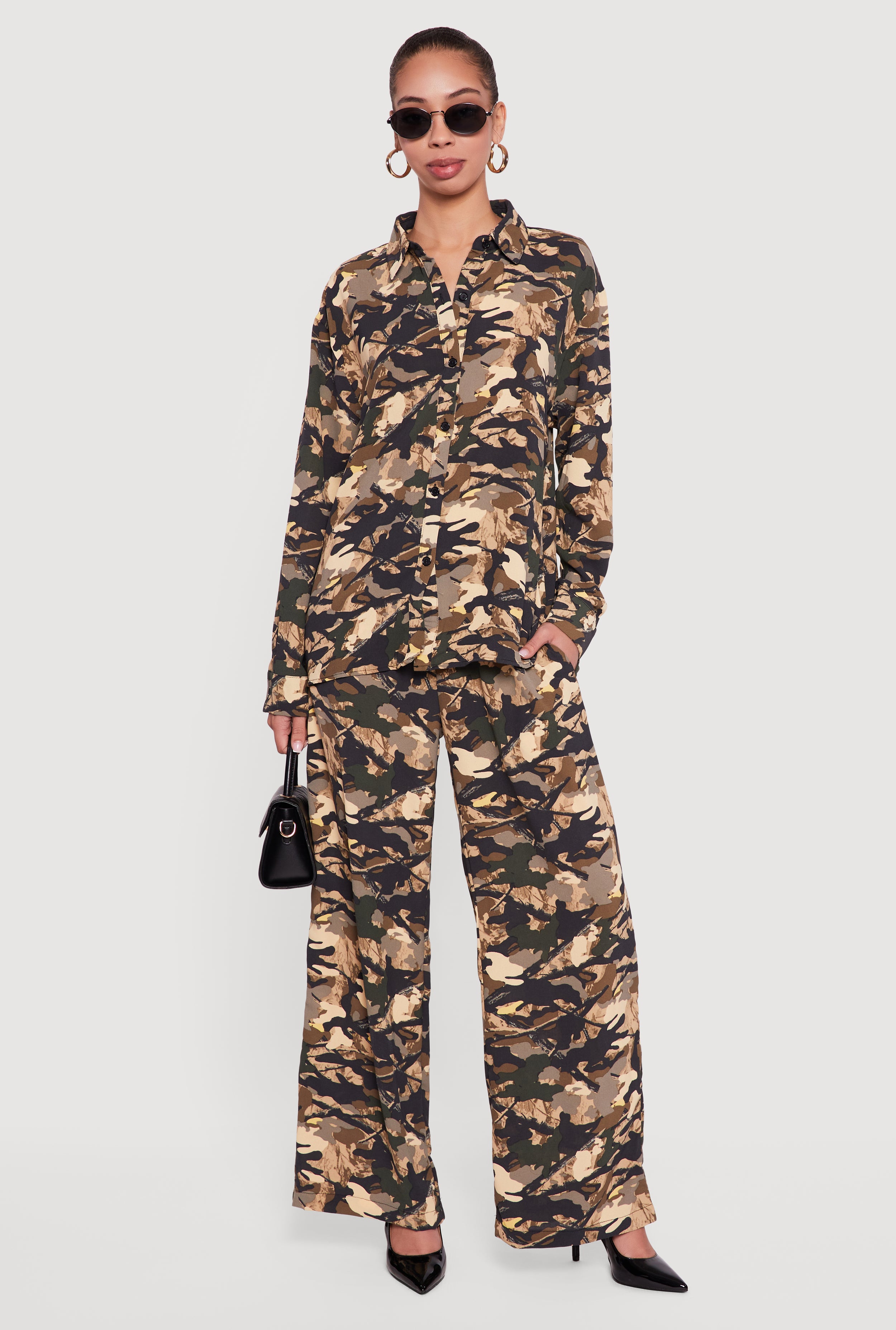 Camouflage Crepe Knit Long Sleeve Button Front Shirt