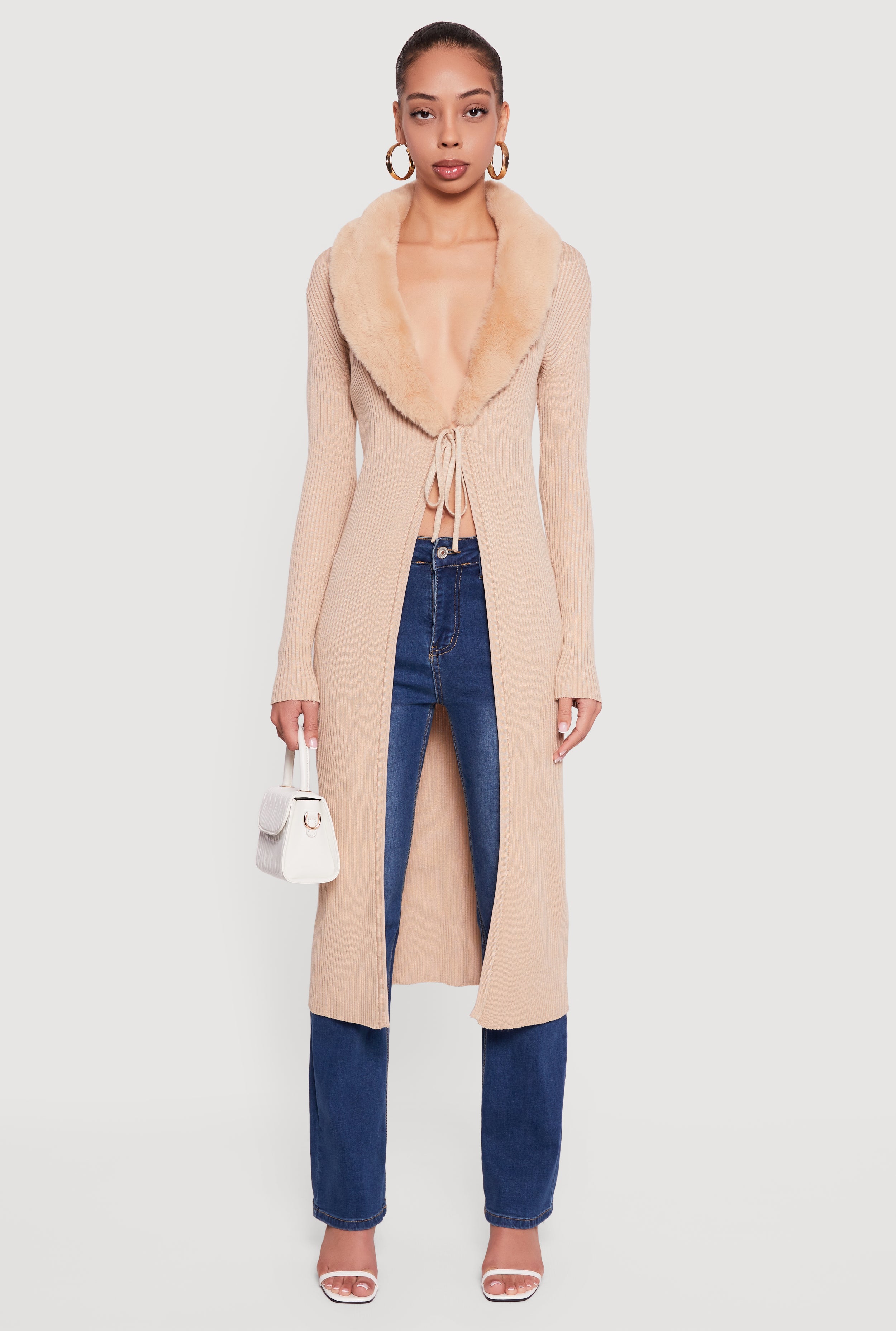 Long Tie Front Duster with Removable Faux Fur Collar