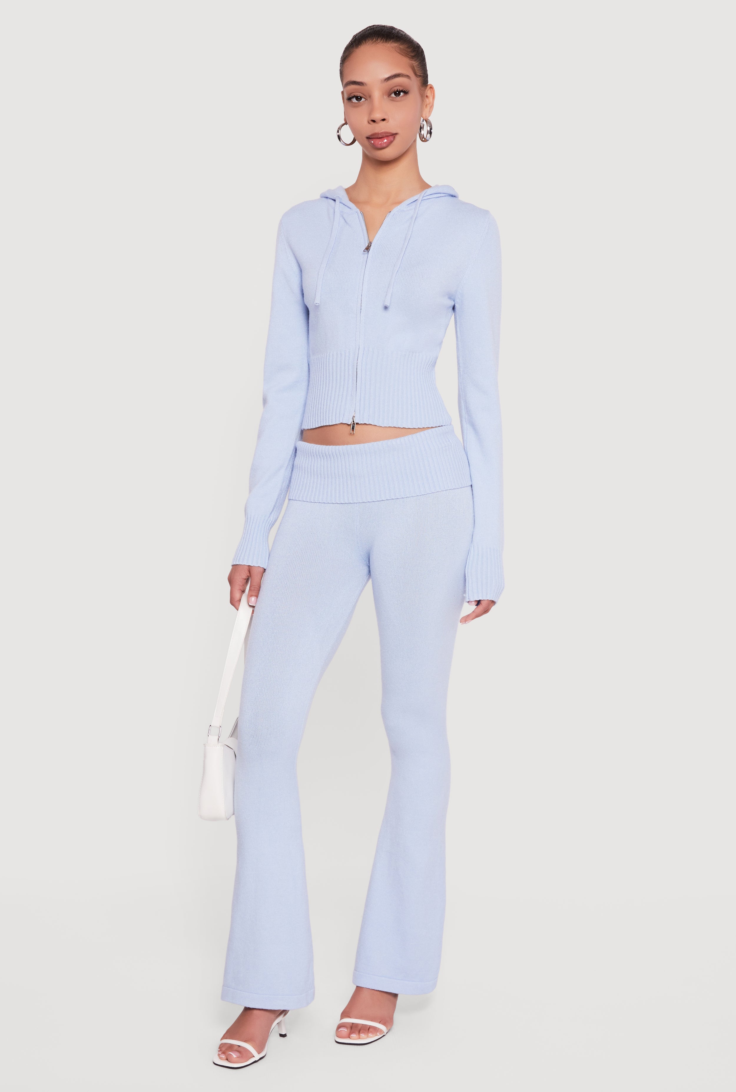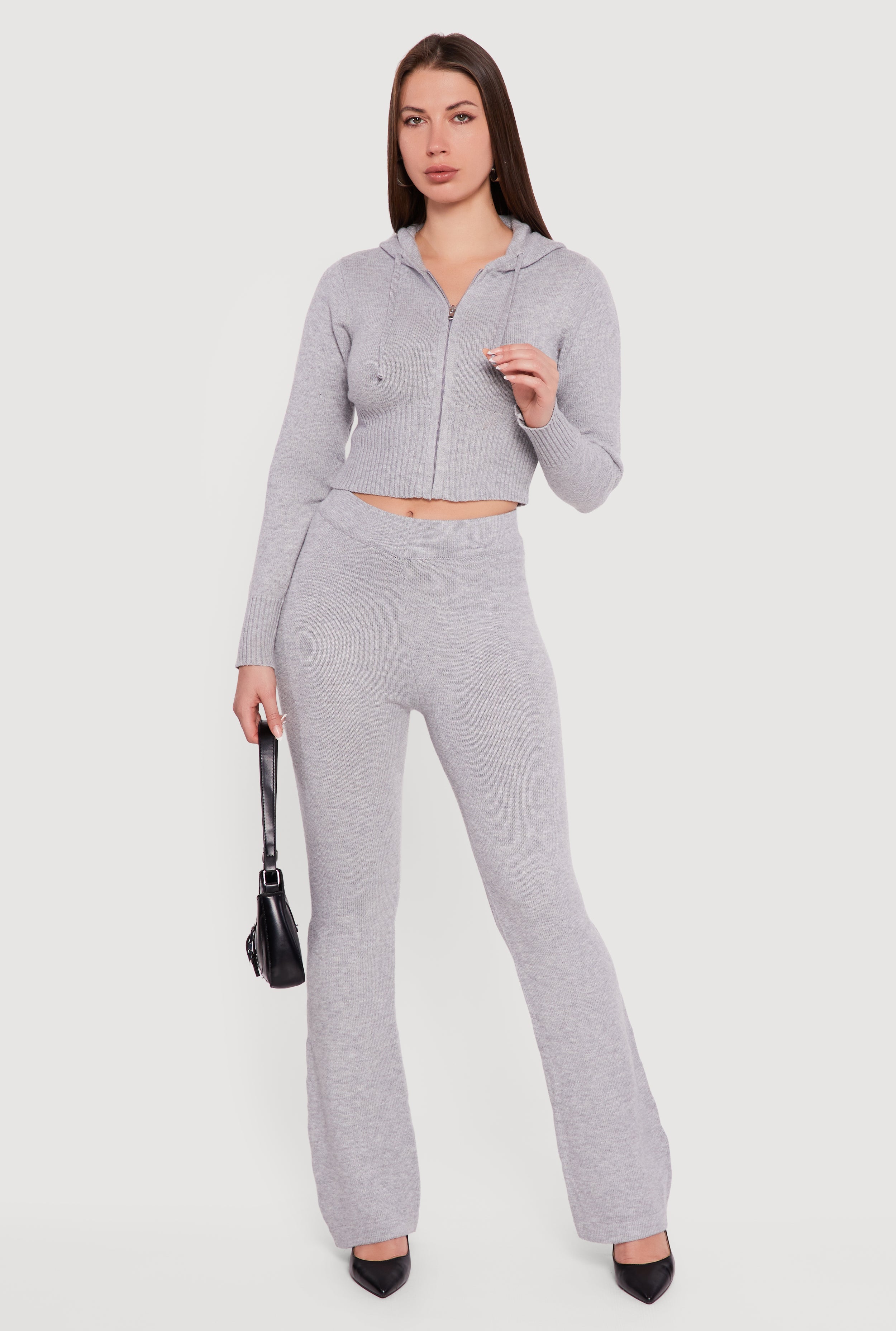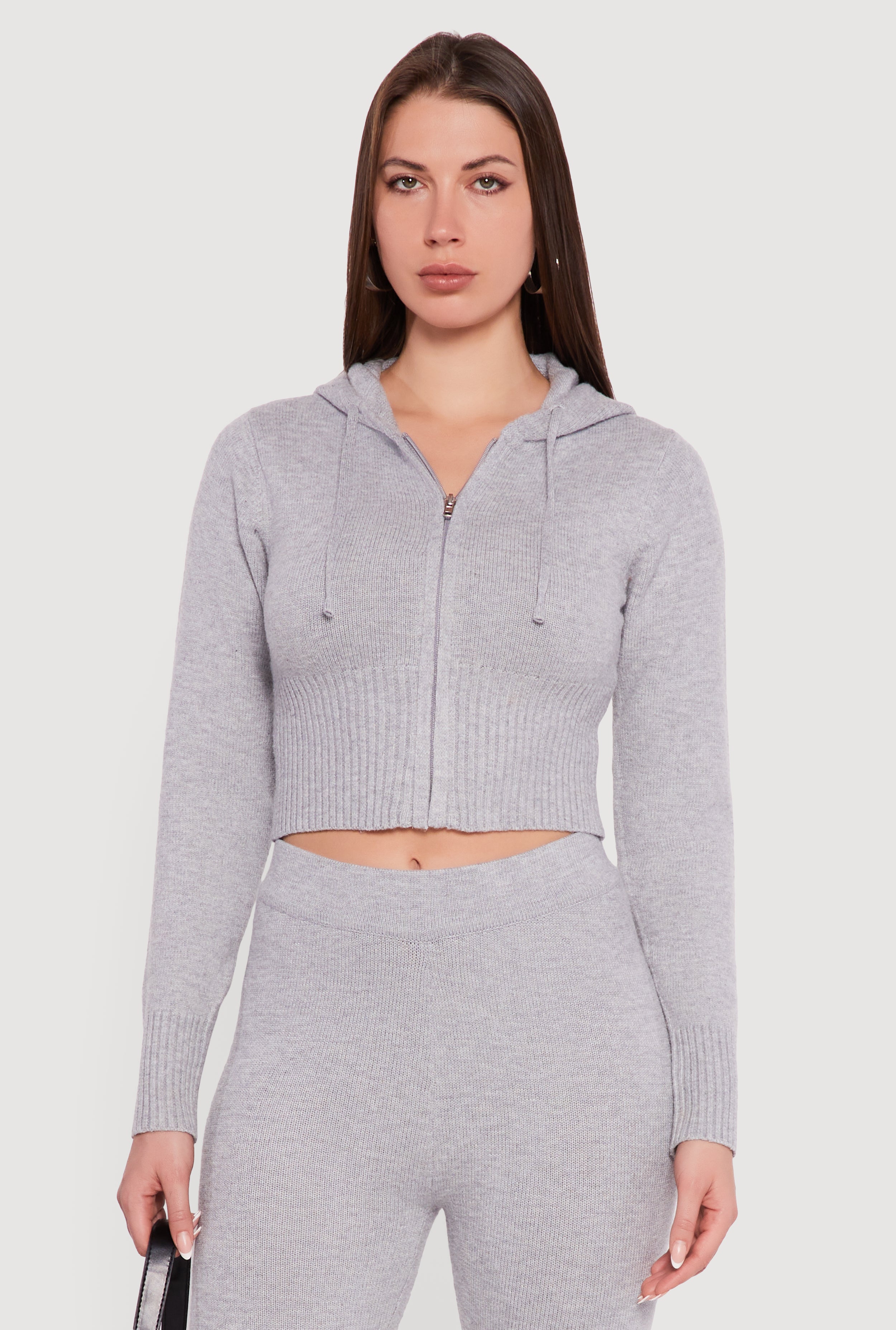Cropped Ribbed Knit Zip Front Hooded Cardigan