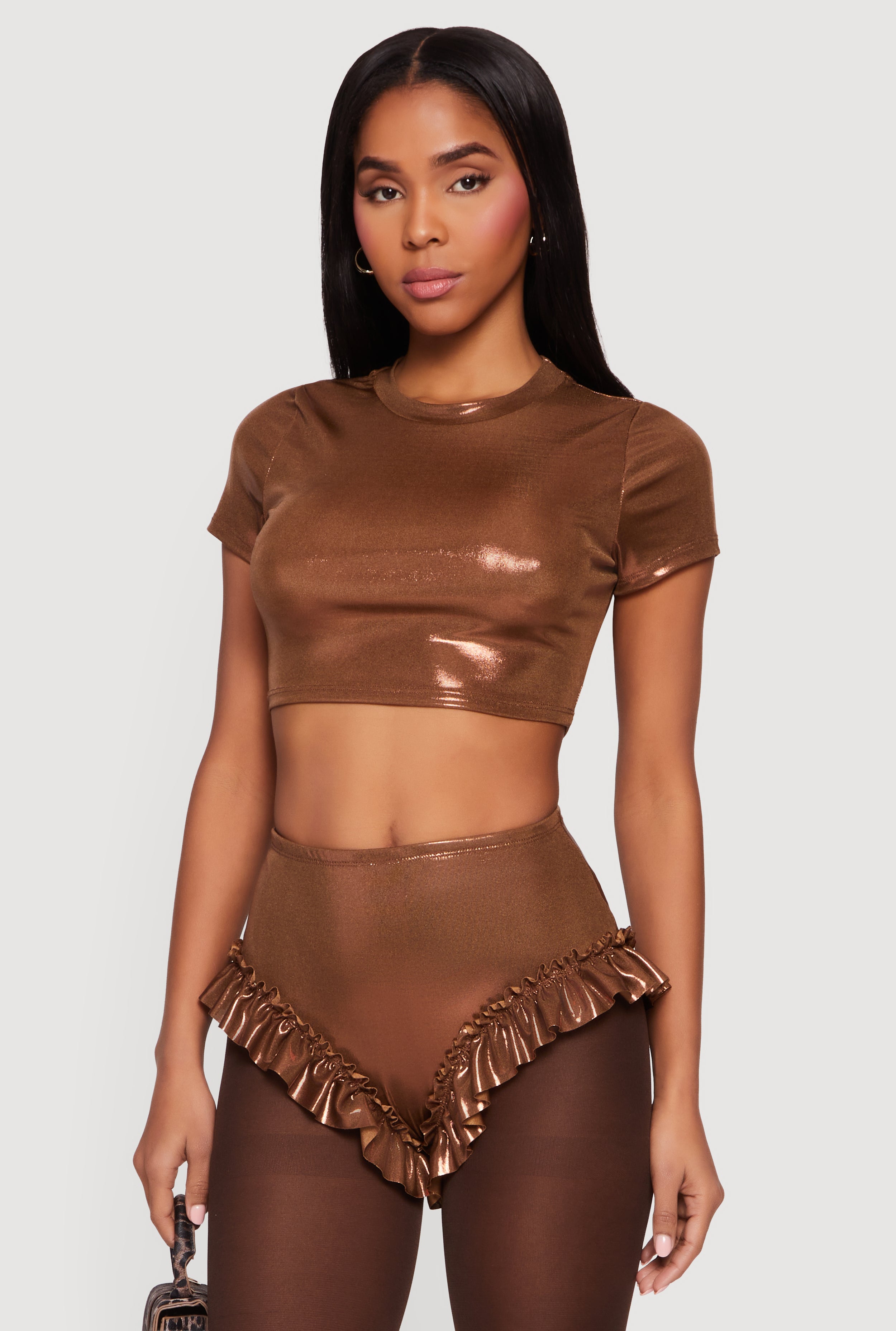 Metallic Foil Screen Short Sleeve Crop Top