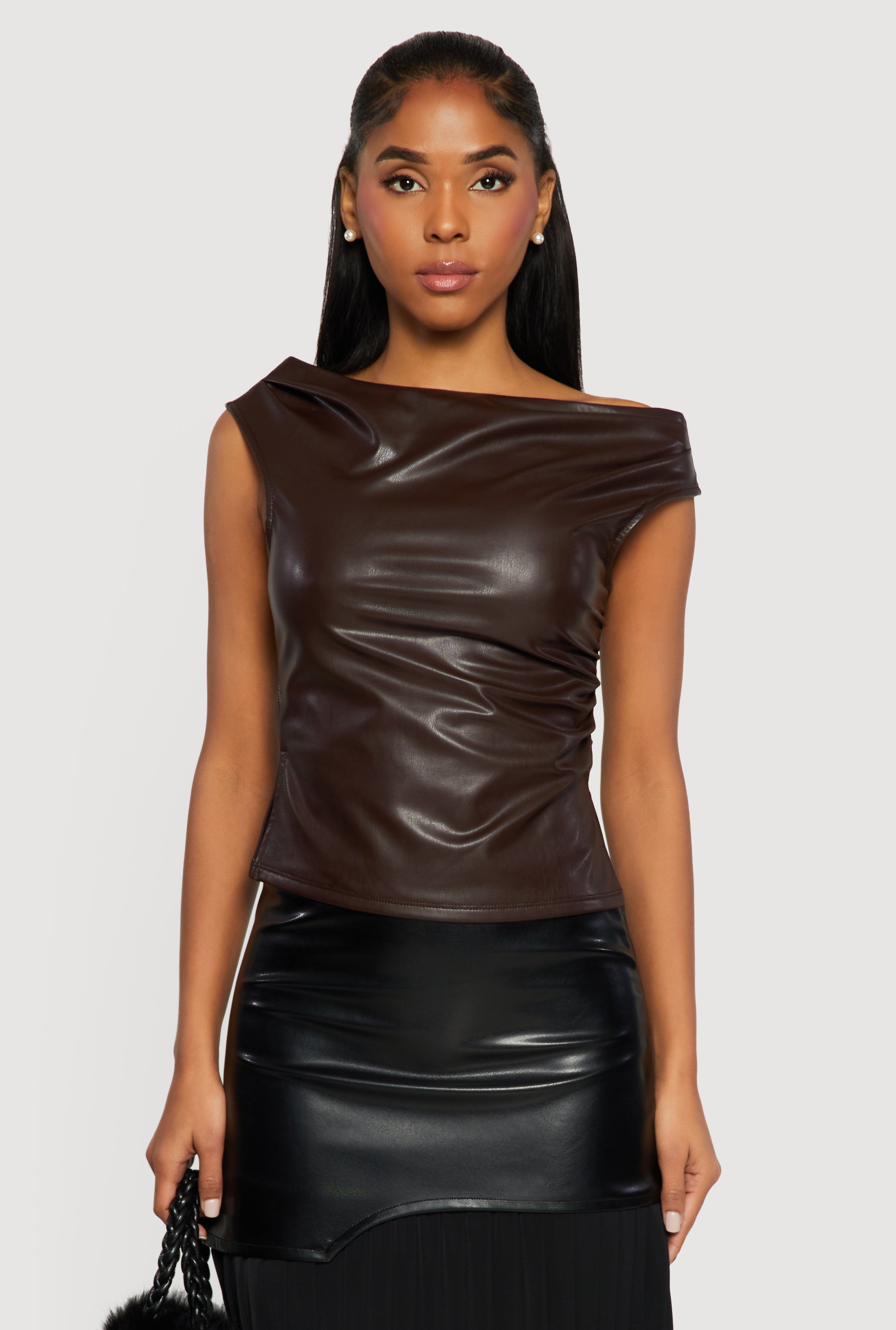 Side Slit Ruched Faux Leather Boat Neck Top