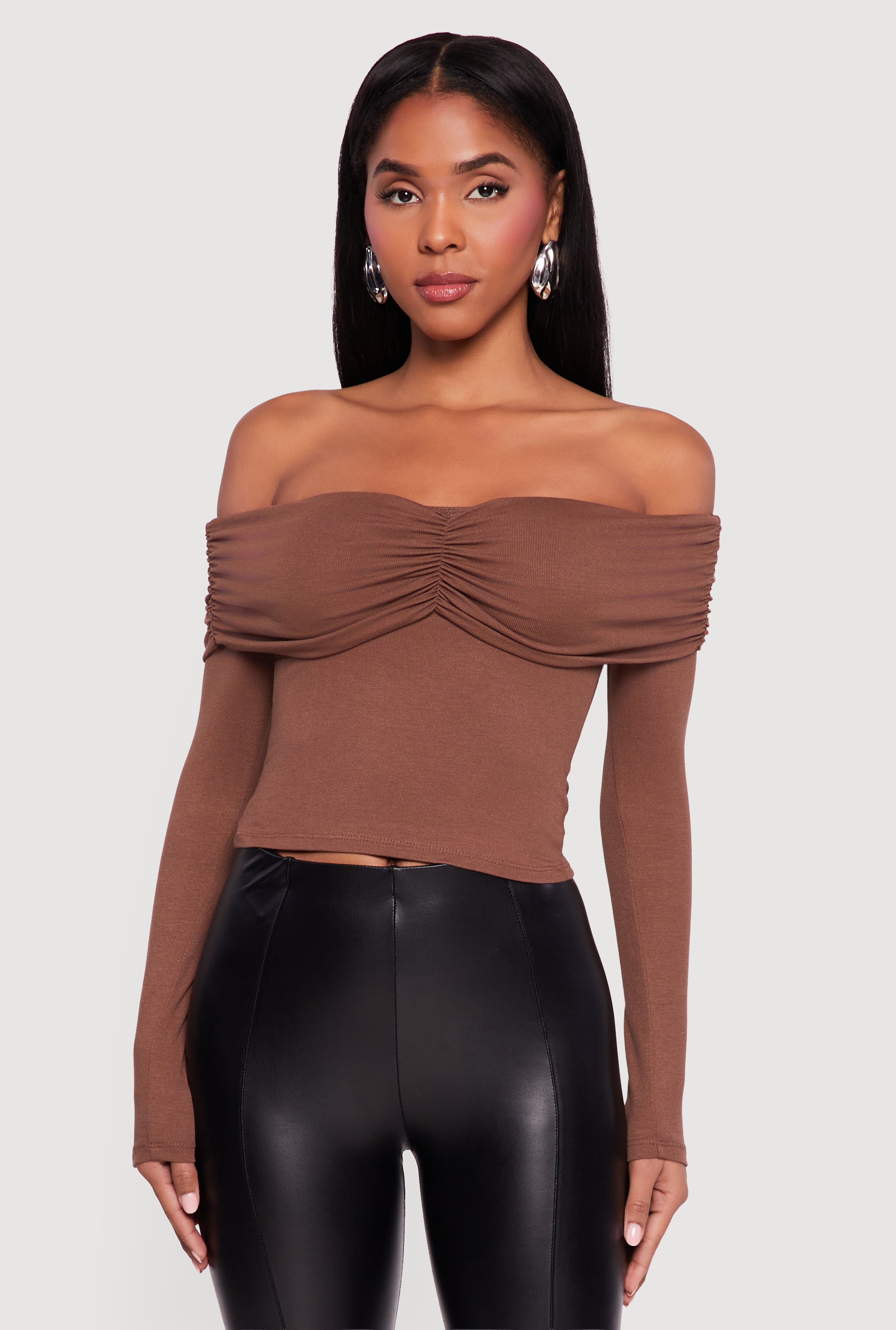 Ruched Fold Over Long Sleeve Off the Shoulder Top