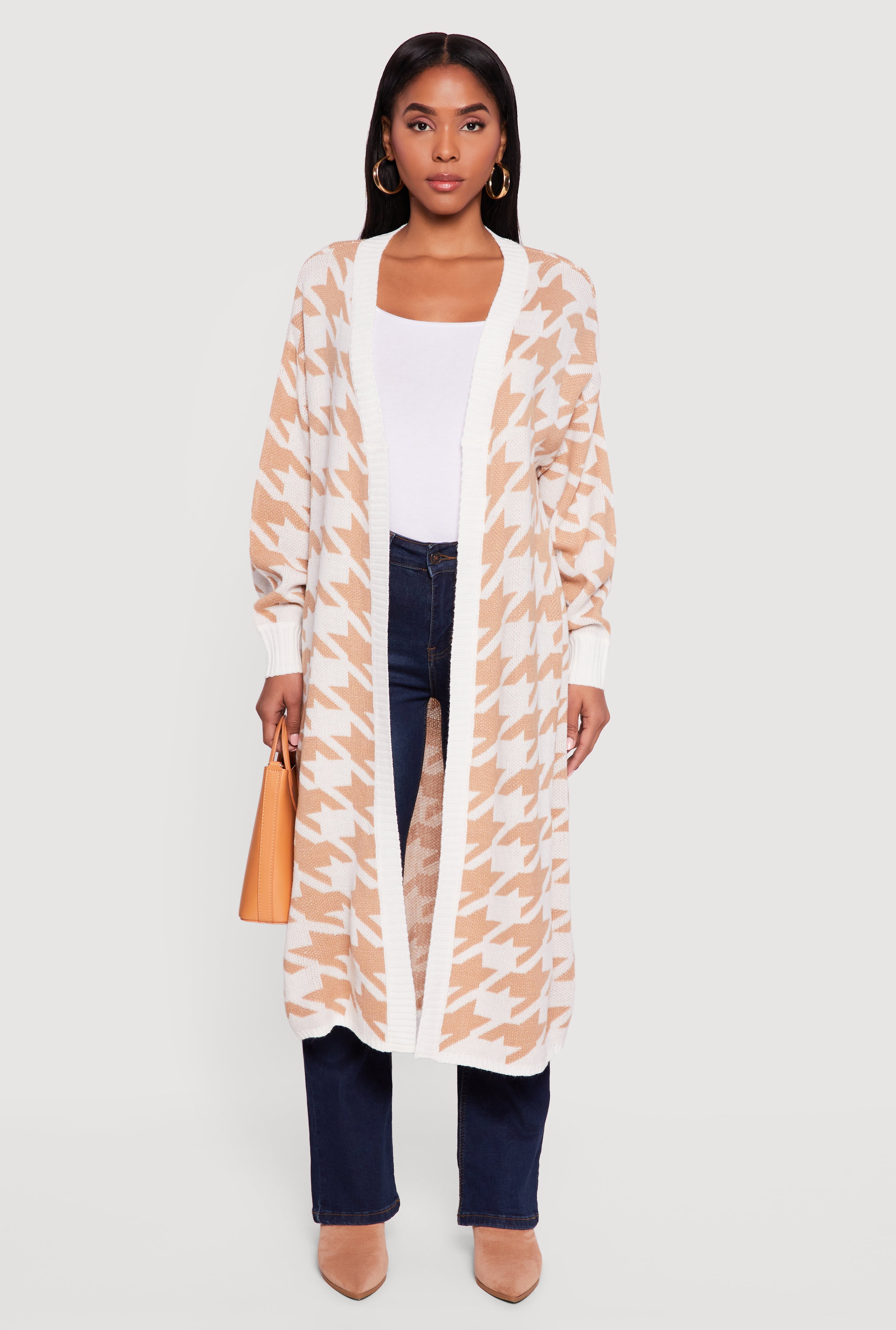 Houndstooth Open Front Long Cardigan