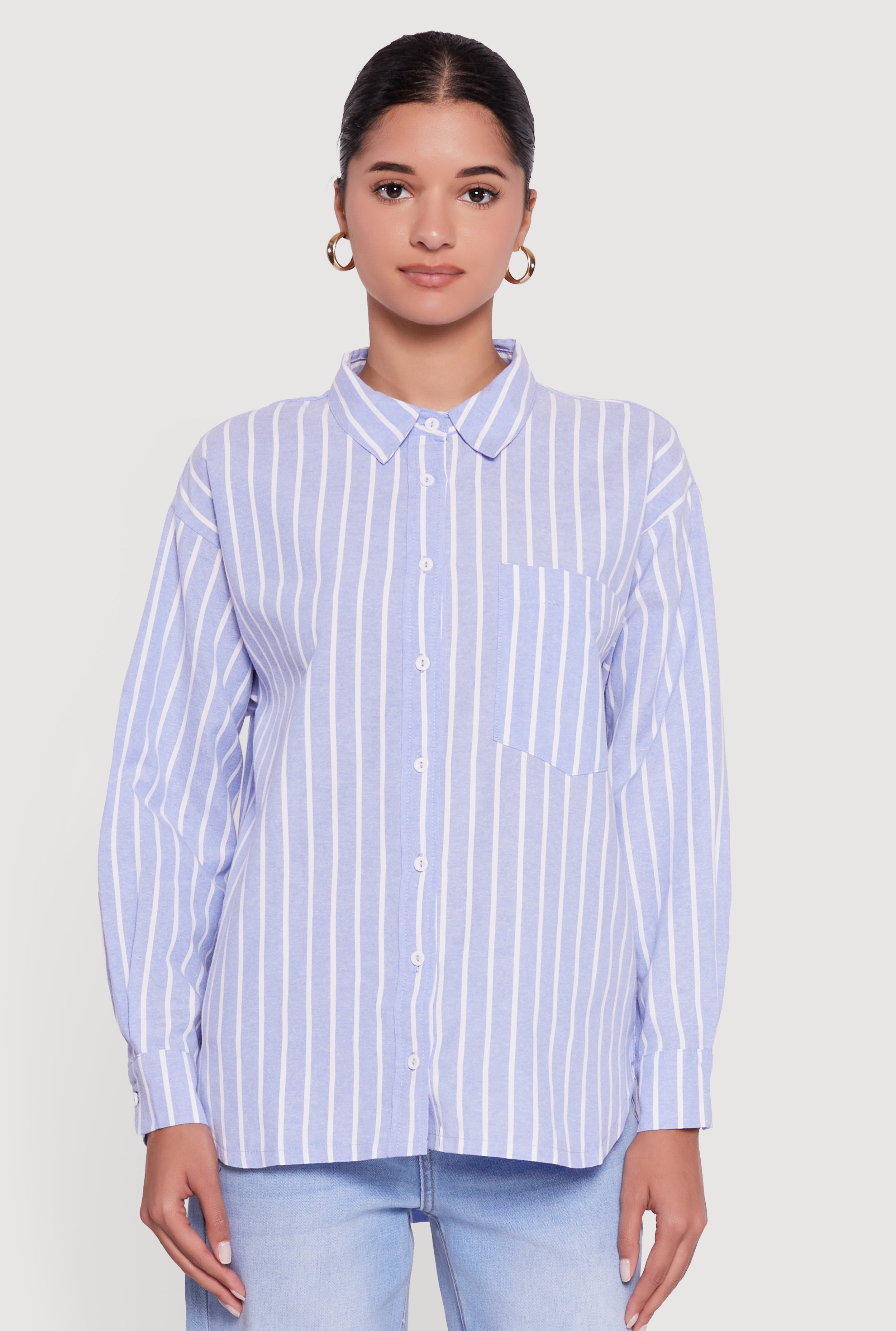 Striped Poplin Button Front Long Sleeve Shirt