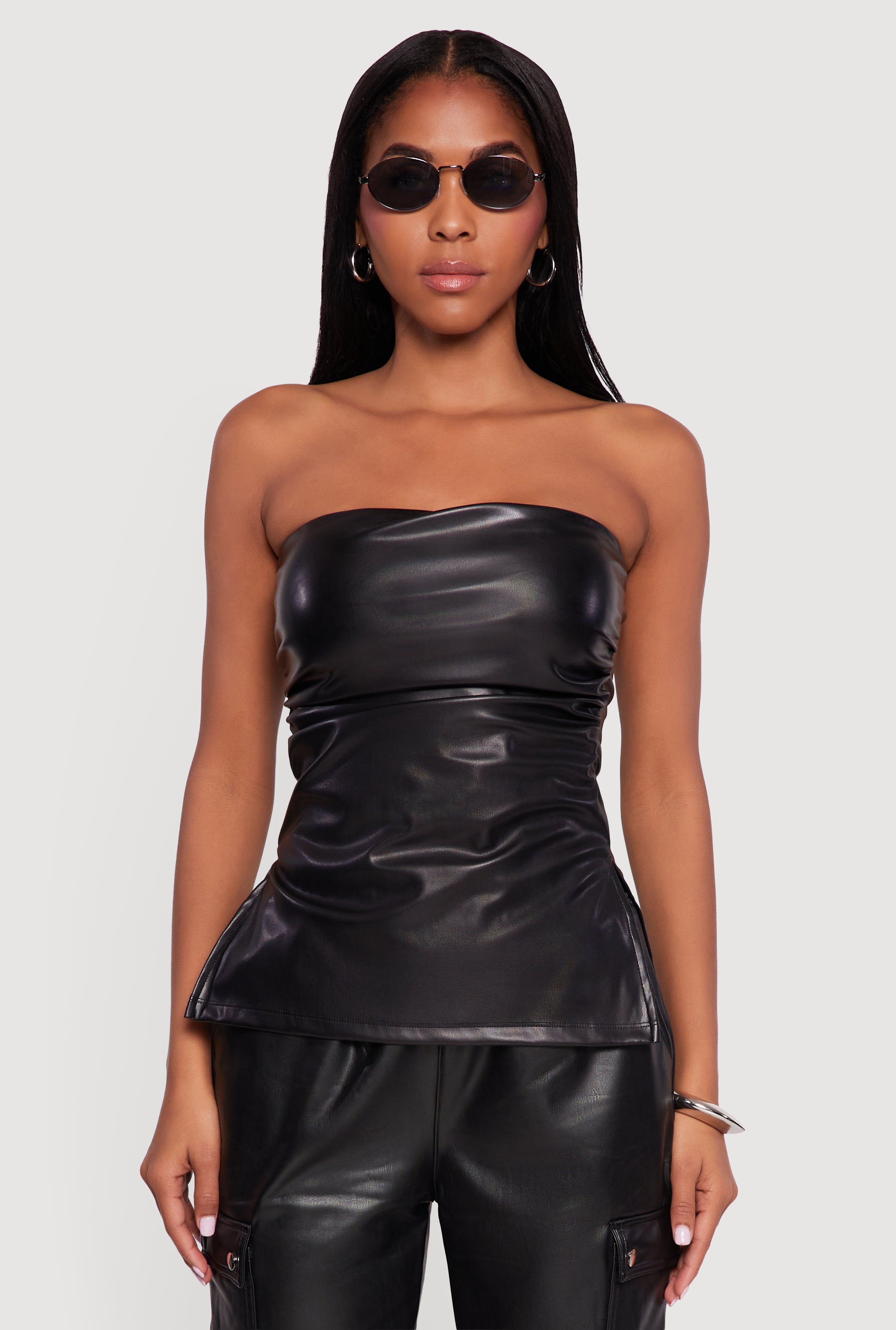 Faux Leather Side Ruched Side Slit Tube Top