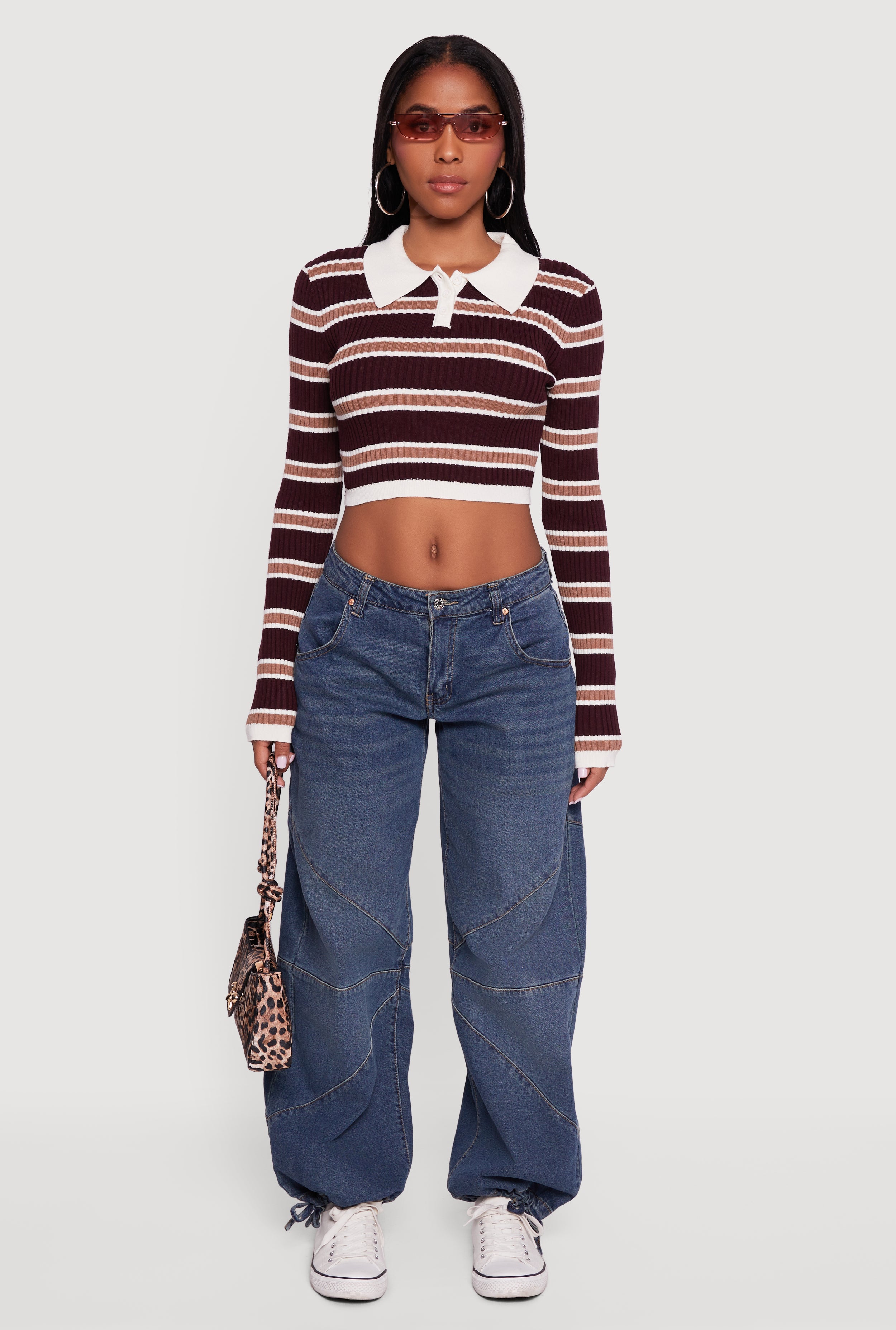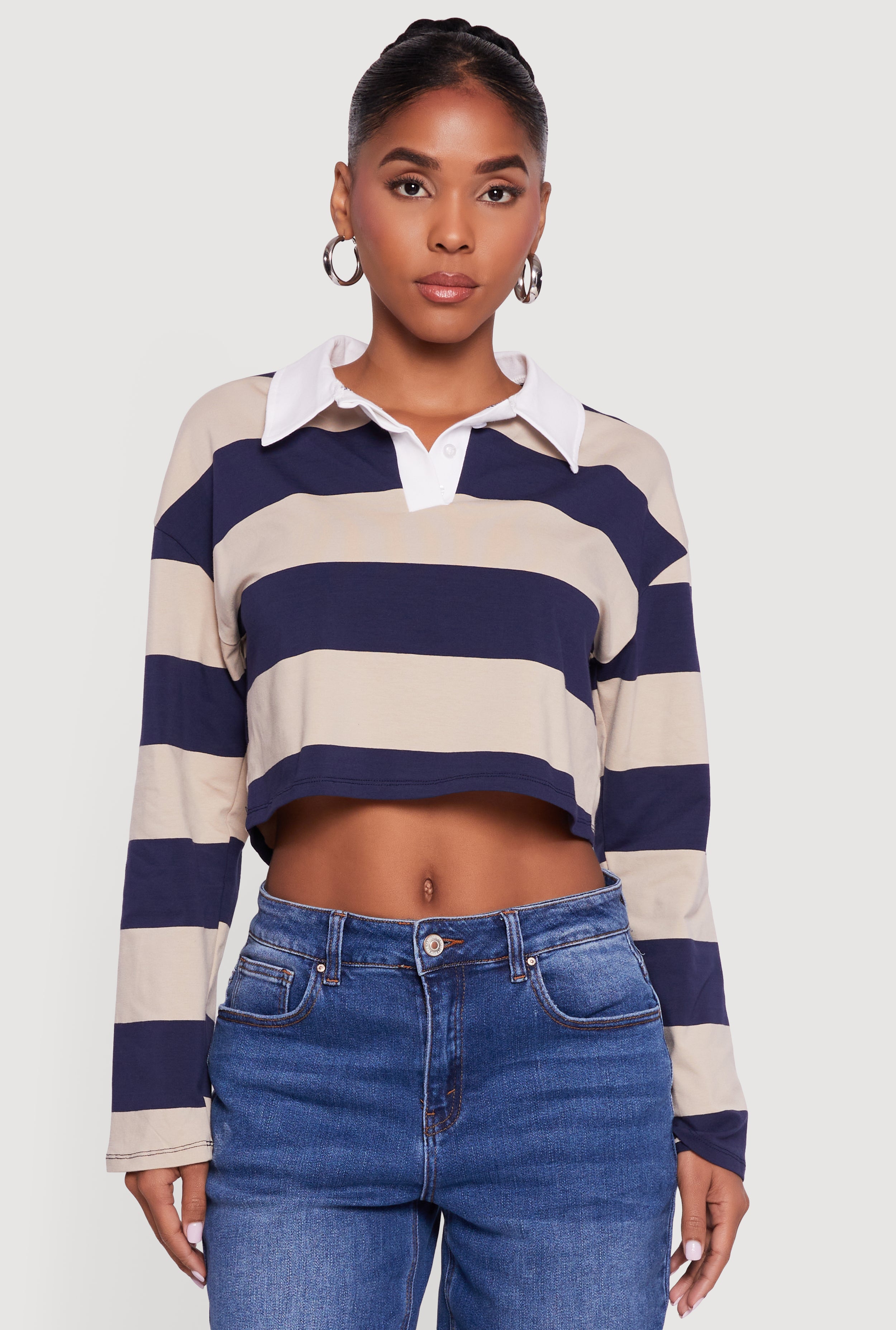 Striped Long Sleeve Polo Crop Top