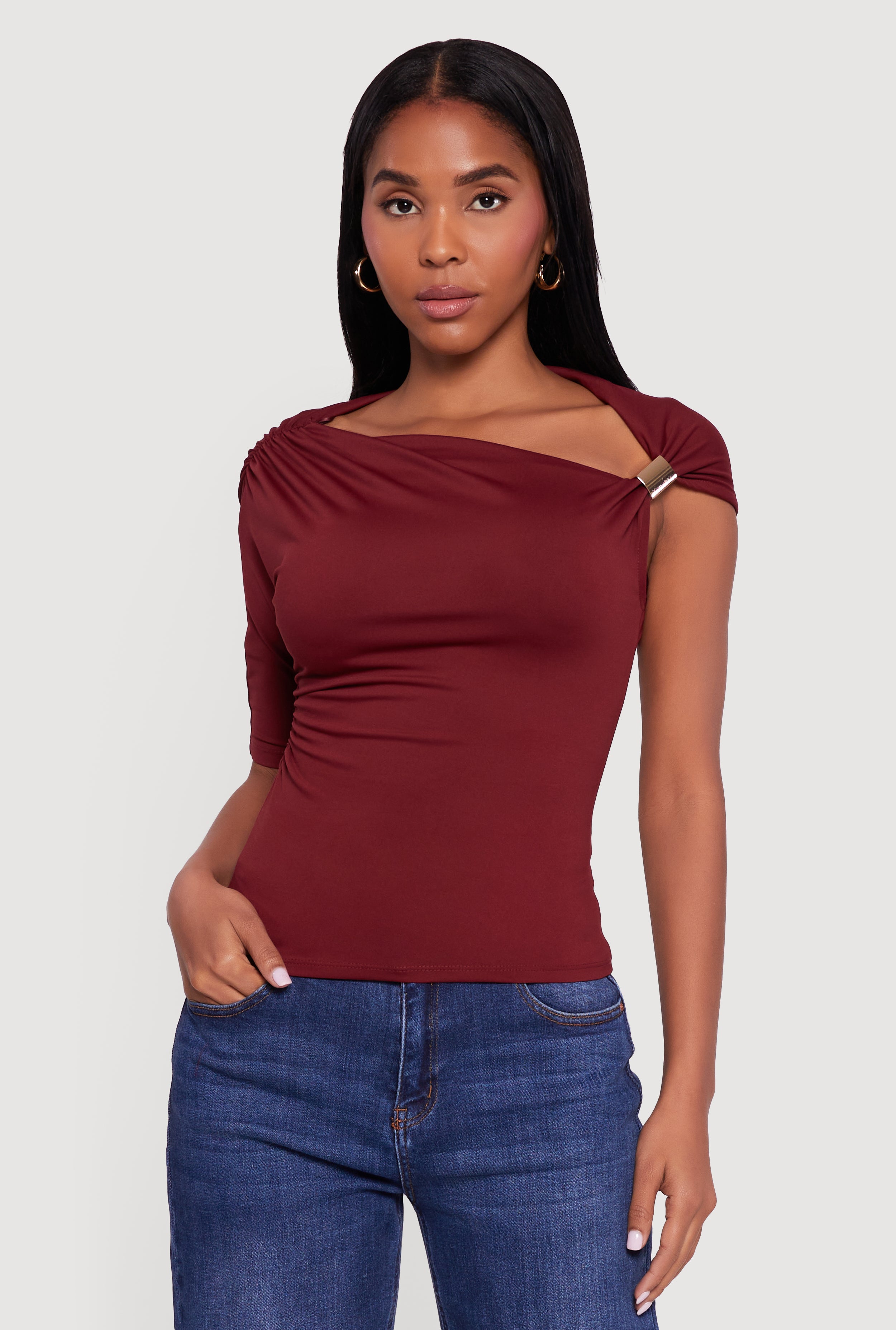 Metallic Detail Asymmetrical Neck Side Ruched Blouse