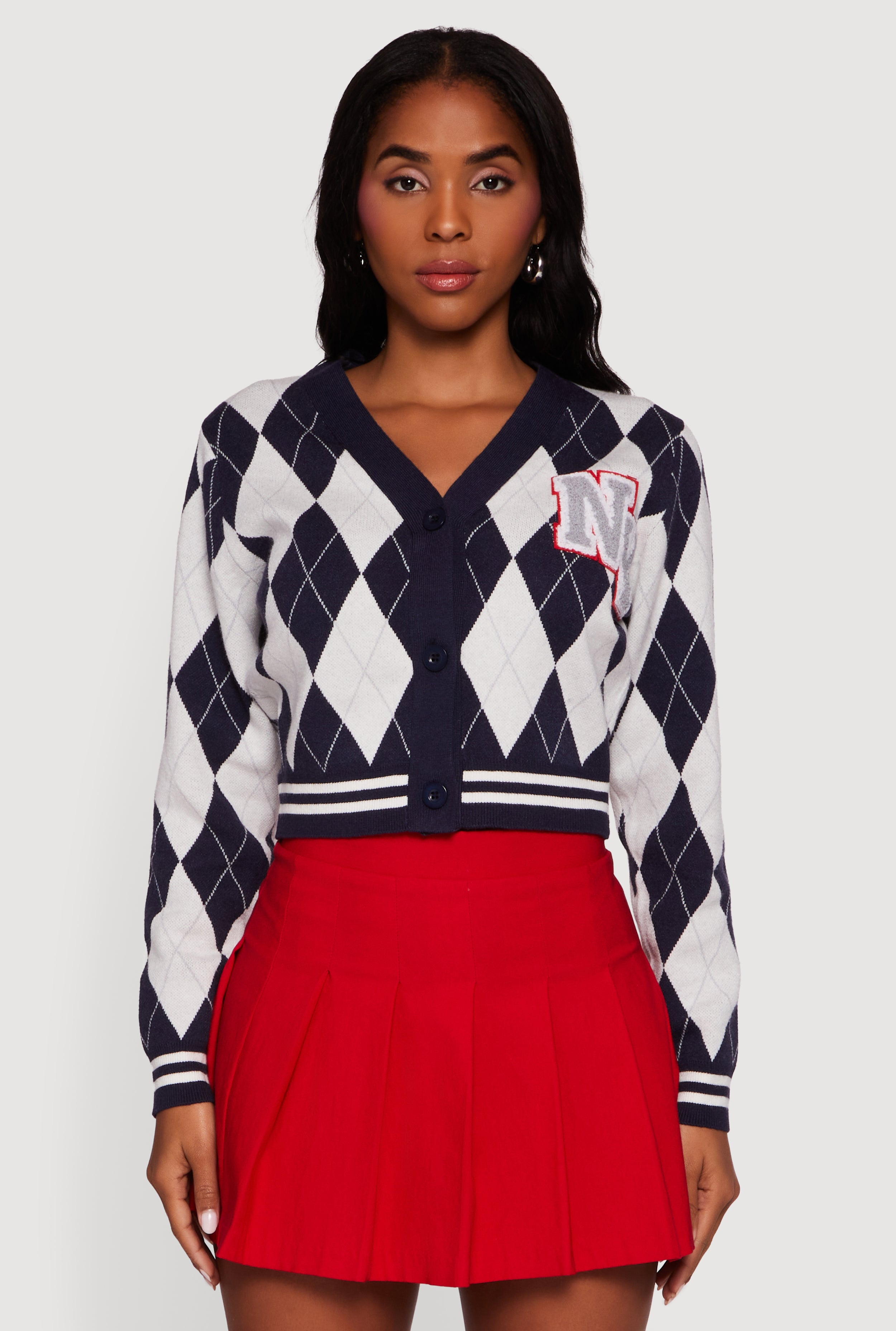Destination Patch Graphic Argyle Plaid Button Front Cardigan