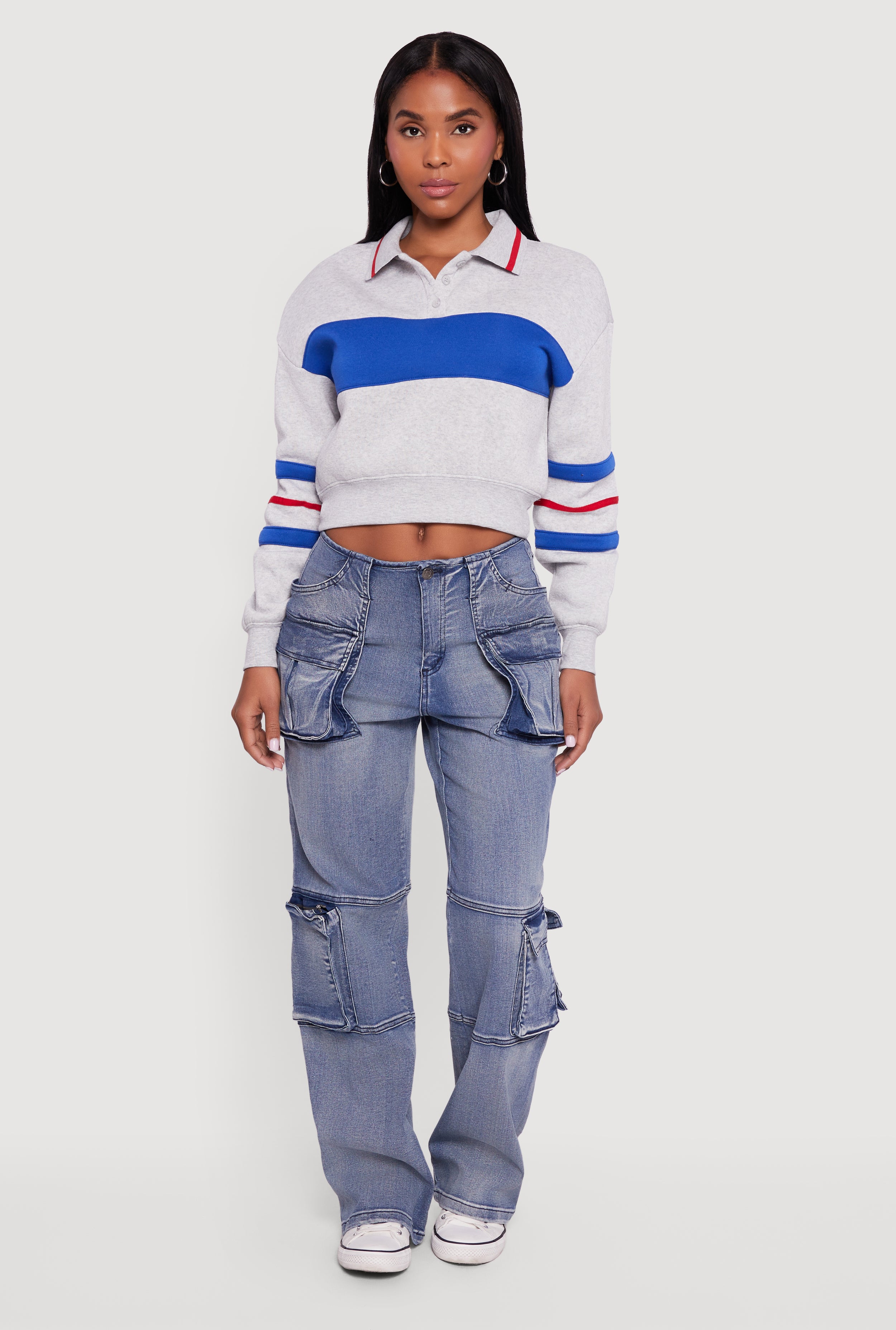 Cropped Color Block Polo Collar Sweatshirt