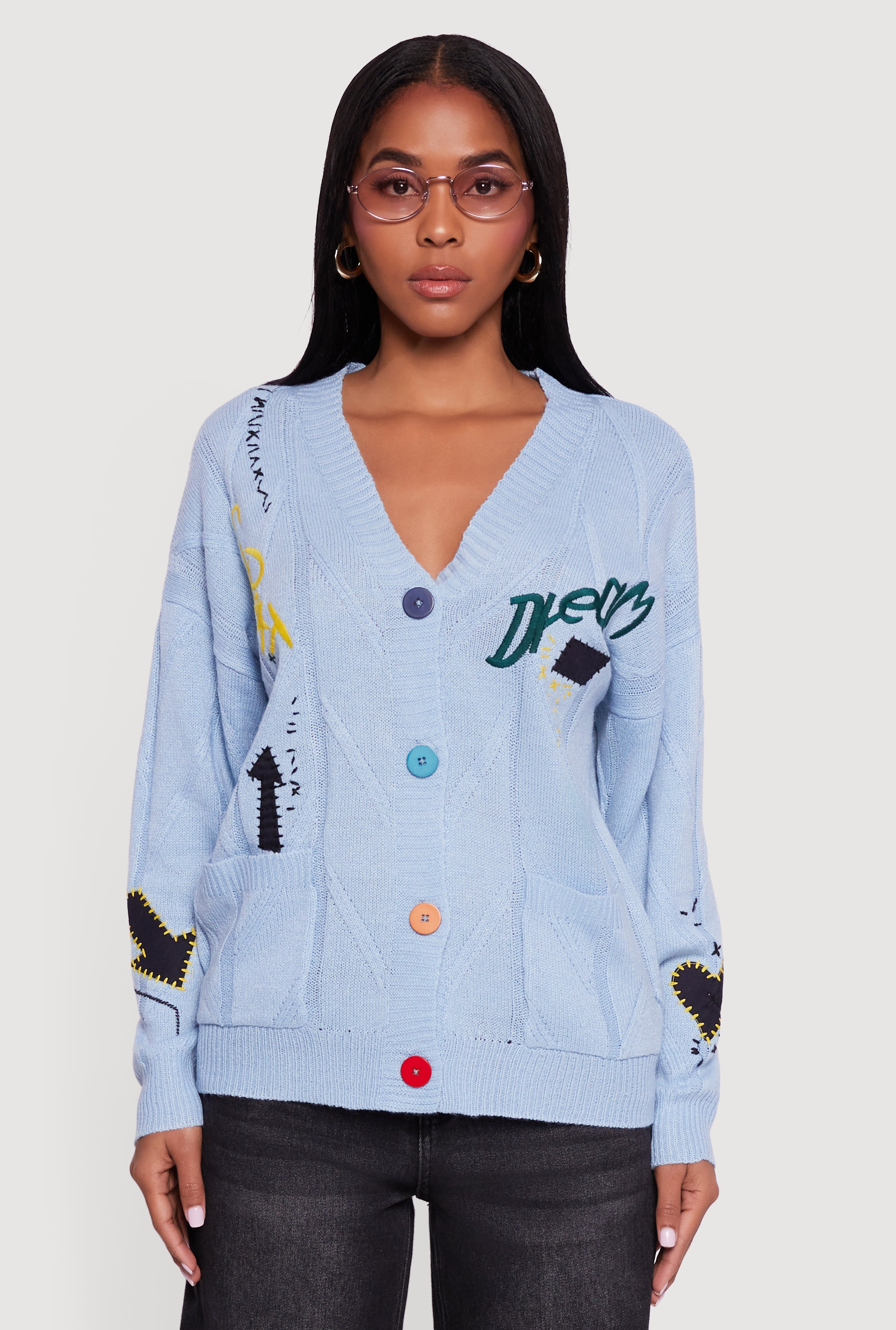 Embroidered Patchwork Graphic Button Front Cardigan
