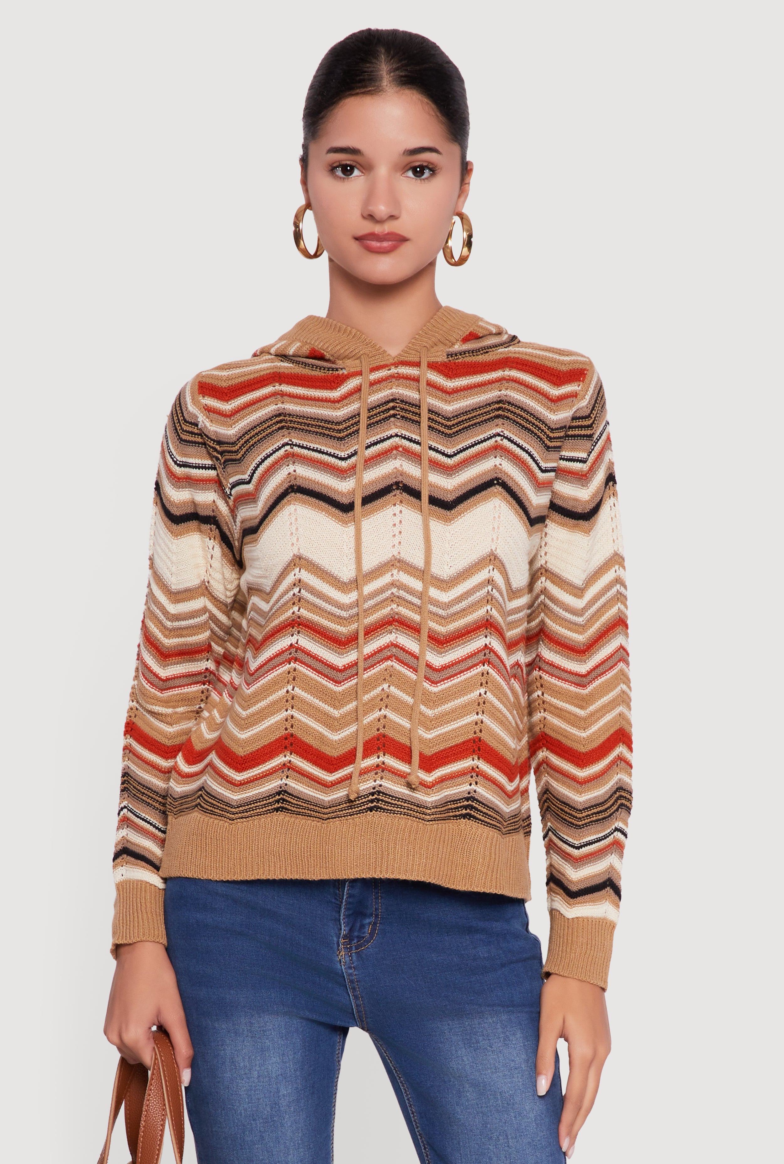 Chevron Pointelle Knit Sweater Hoodie