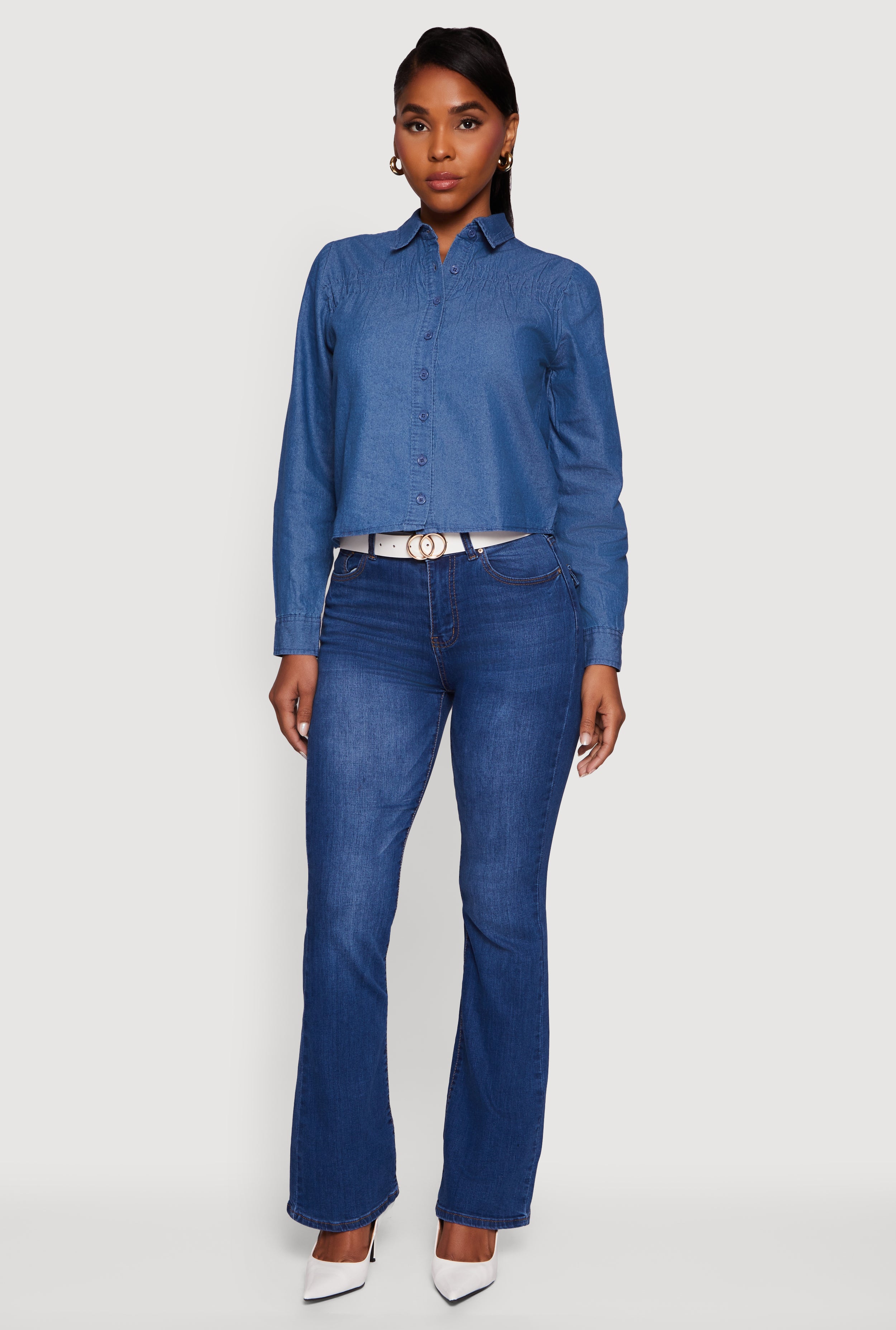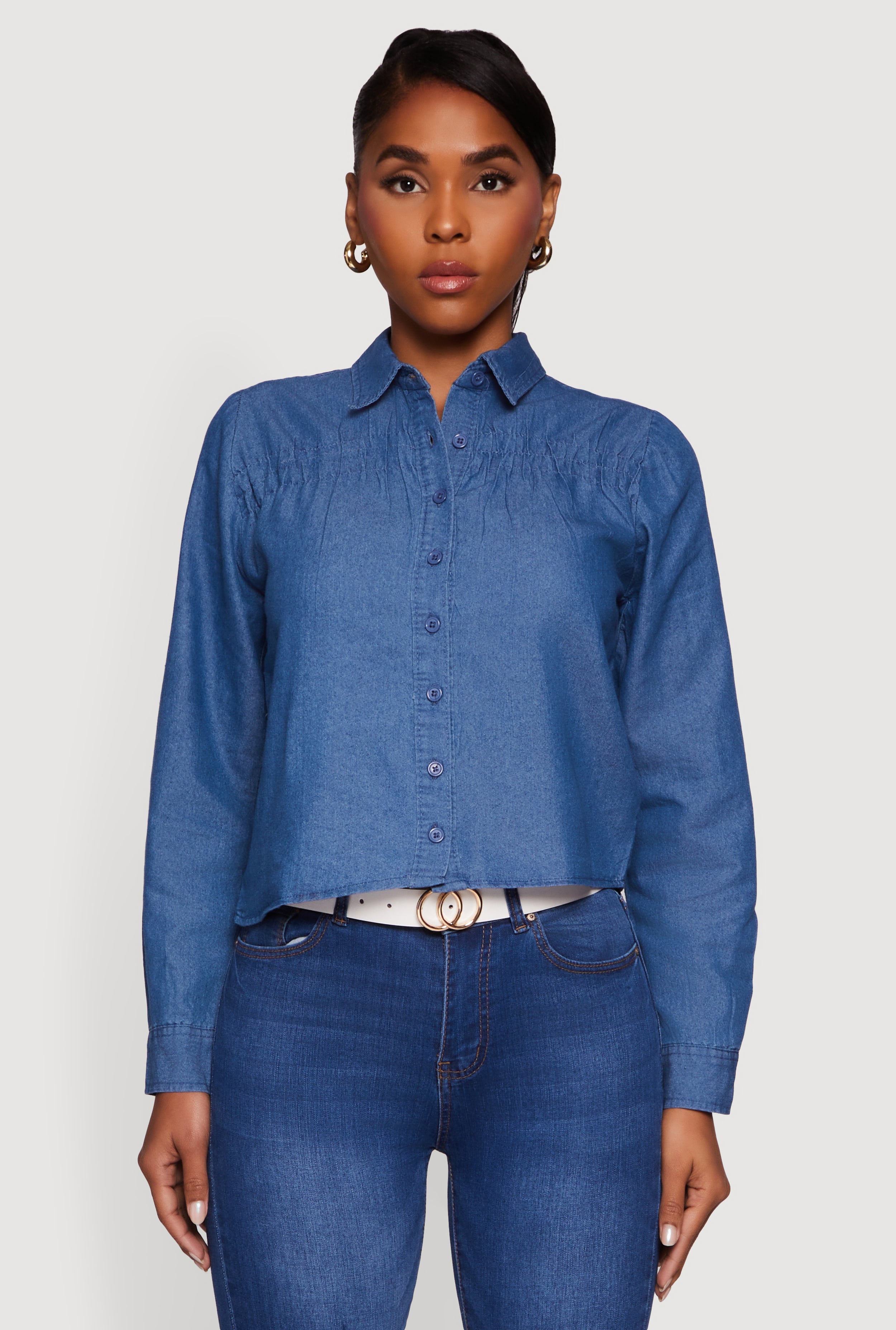 Denim Ruched Long Sleeve Button Front Shirt