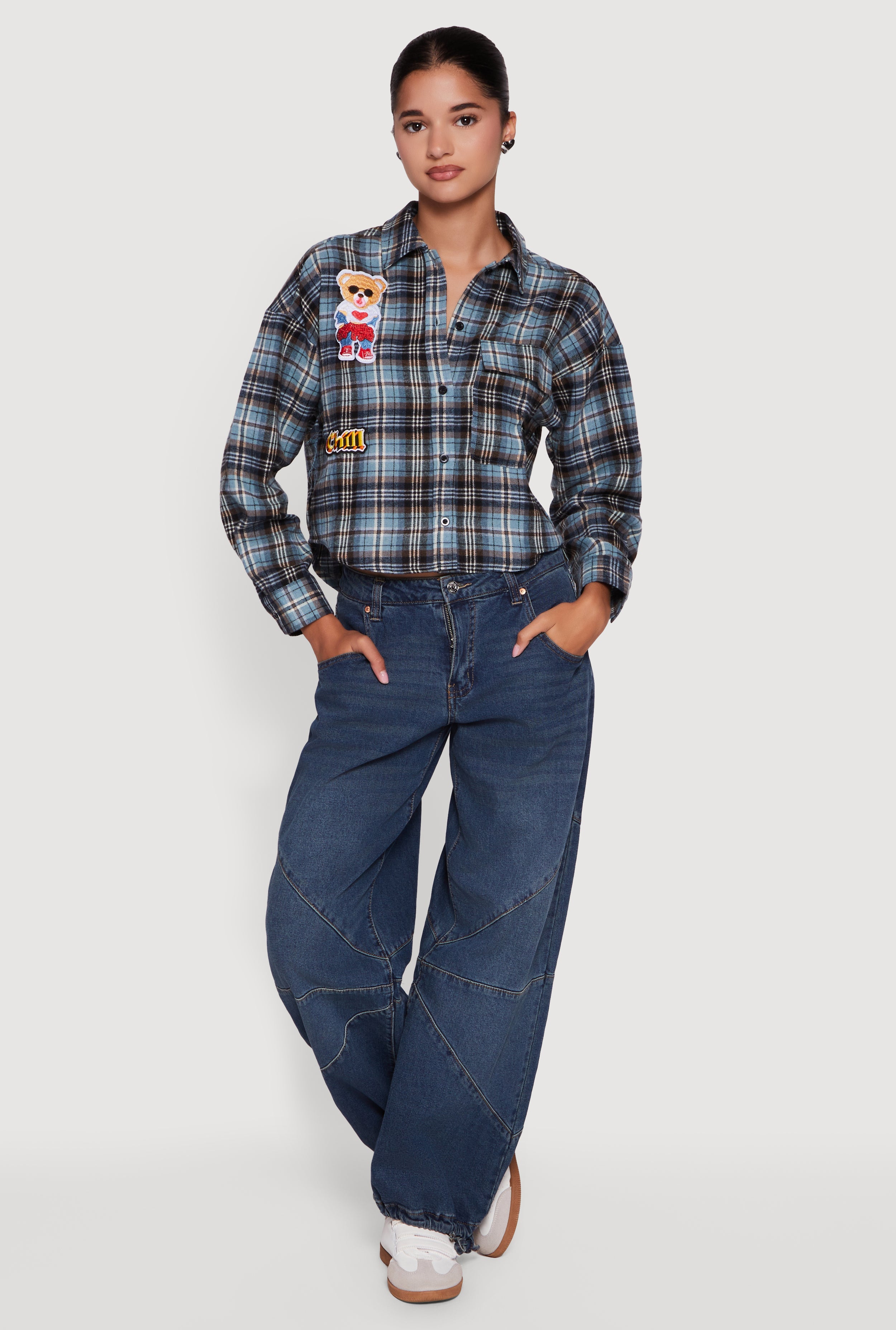 Plaid Flannel Patch Detail Cropped Button Front Shirt