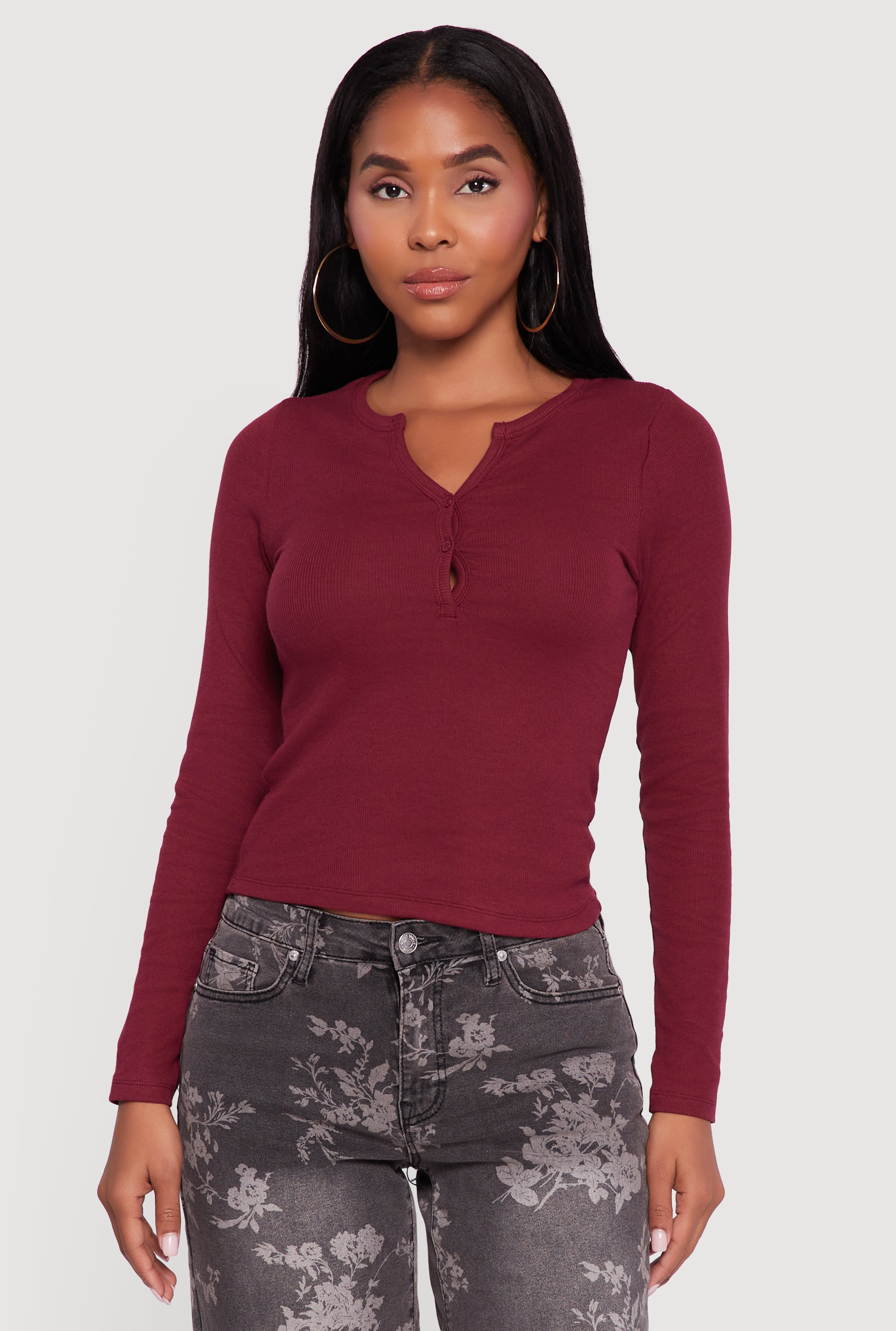 Cropped Long Sleeve Notch Neck Henley Top