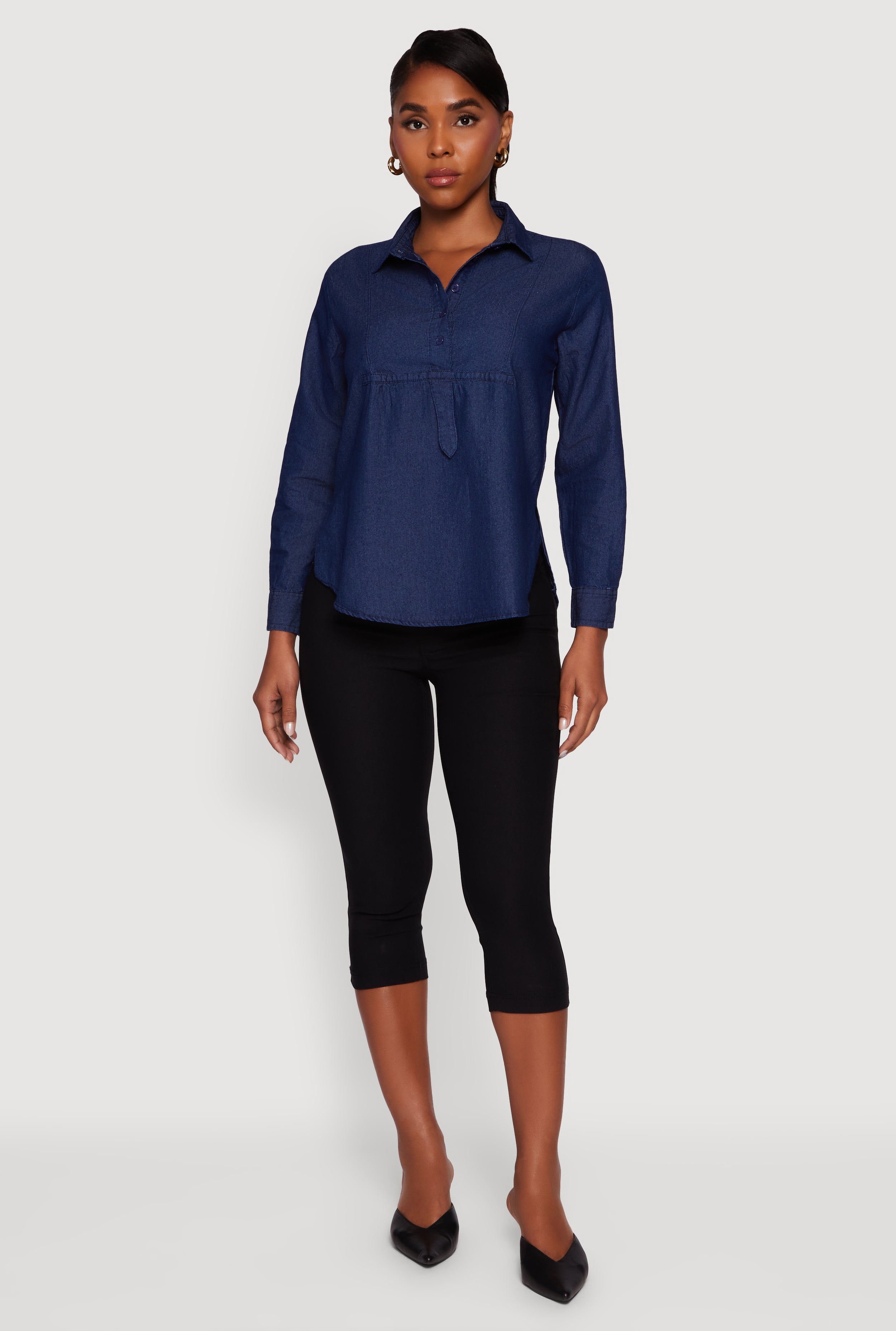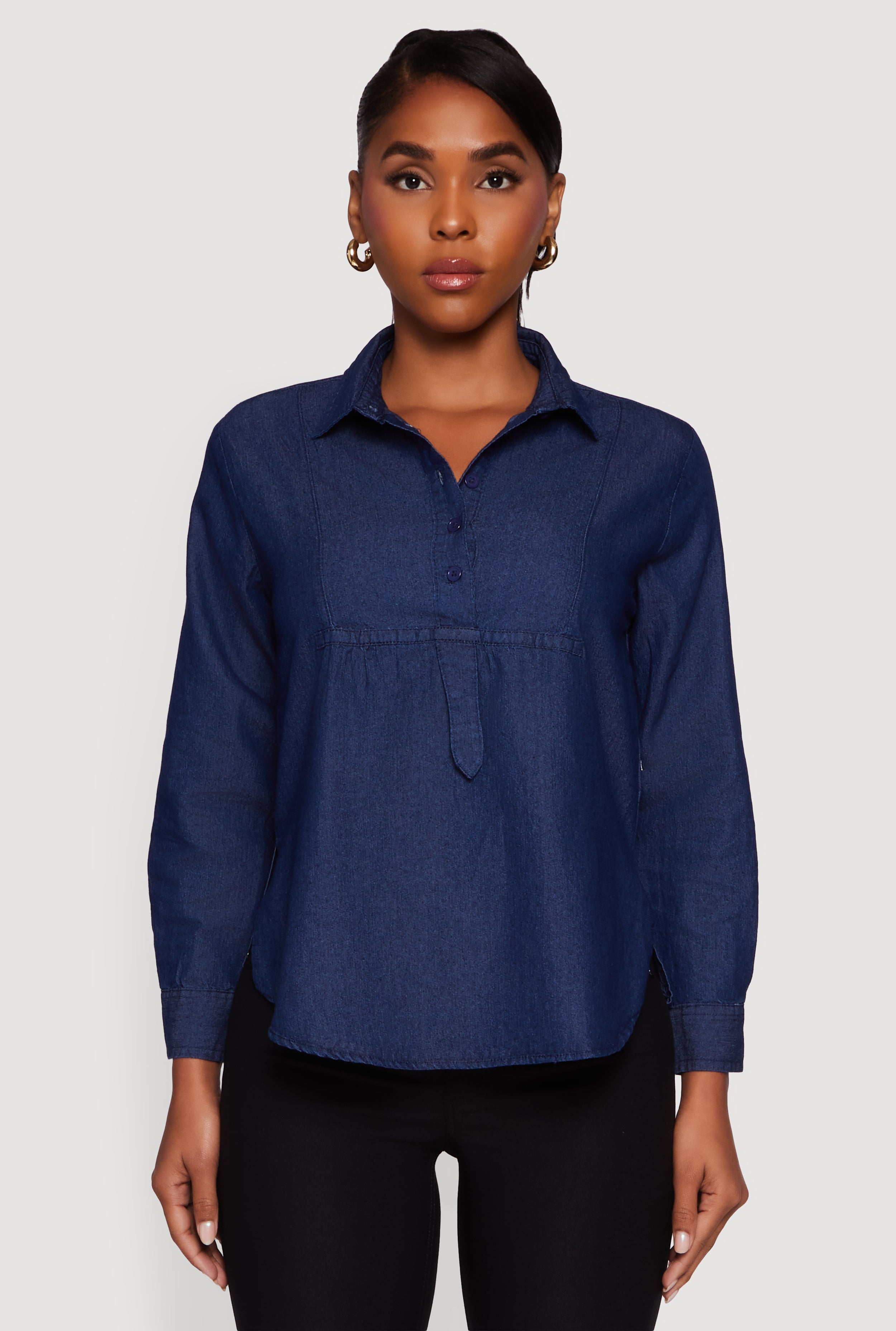 Denim Long Sleeve Half Button Front Blouse