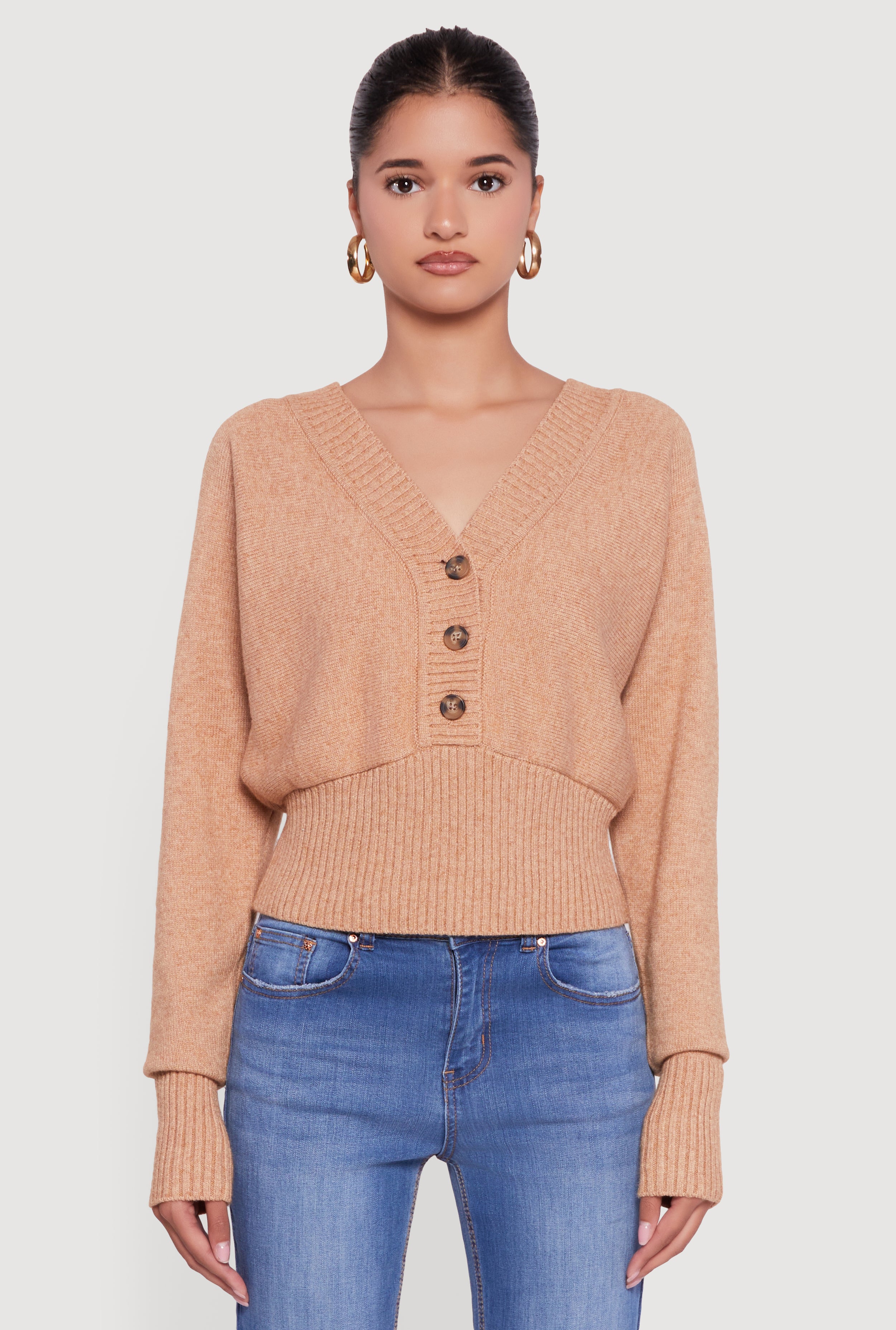 Brushed Knit Long Sleeve V-Neck Sweater