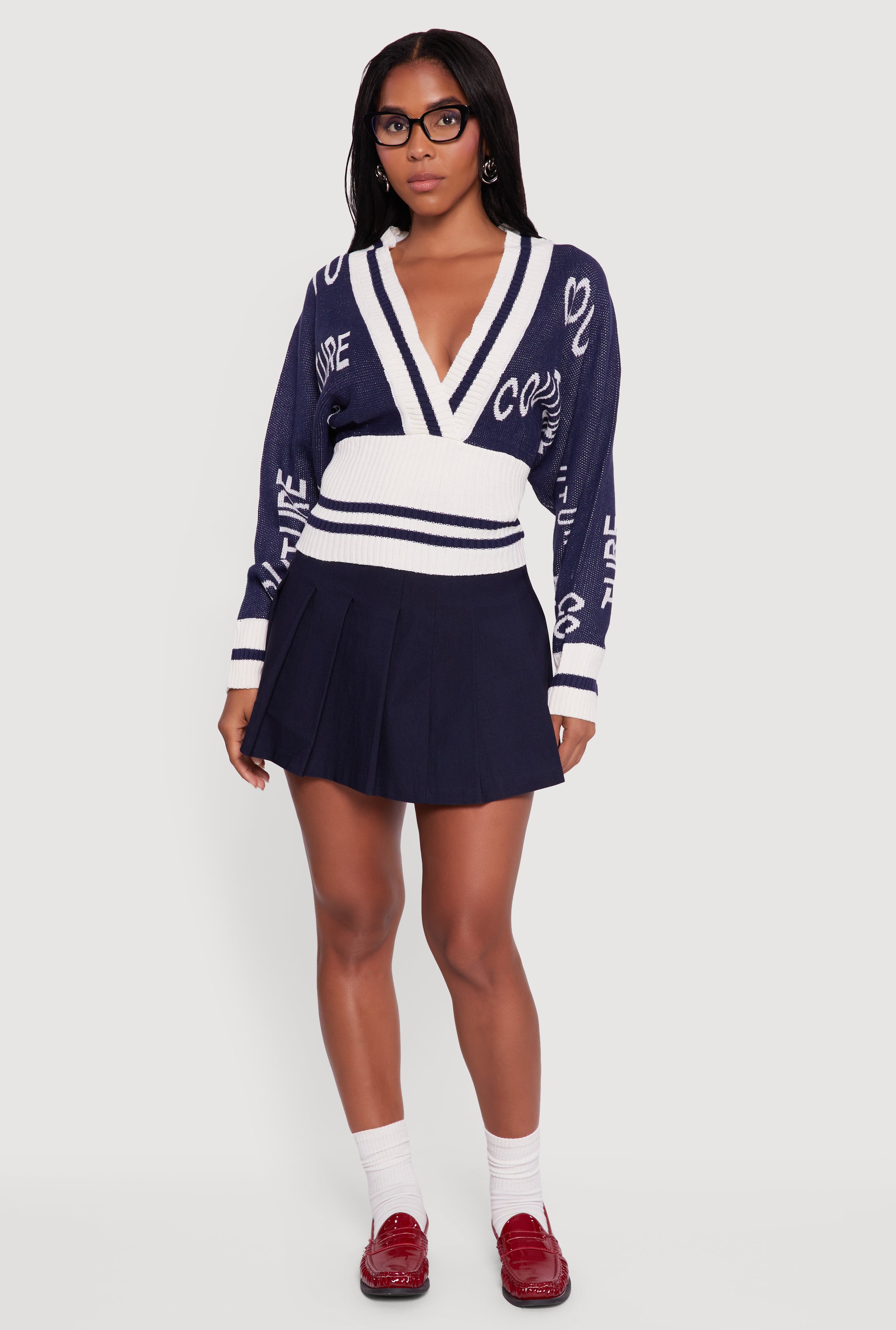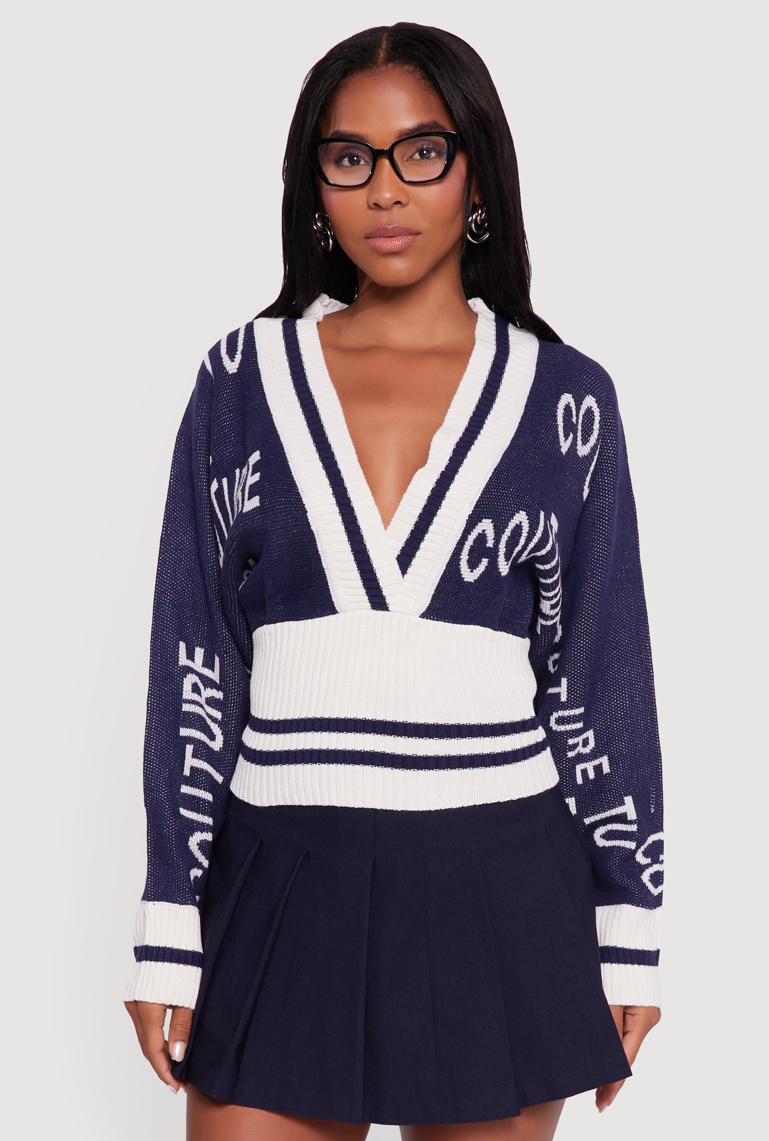 Couture Graphic Long Sleeve Plunge Neck Sweater