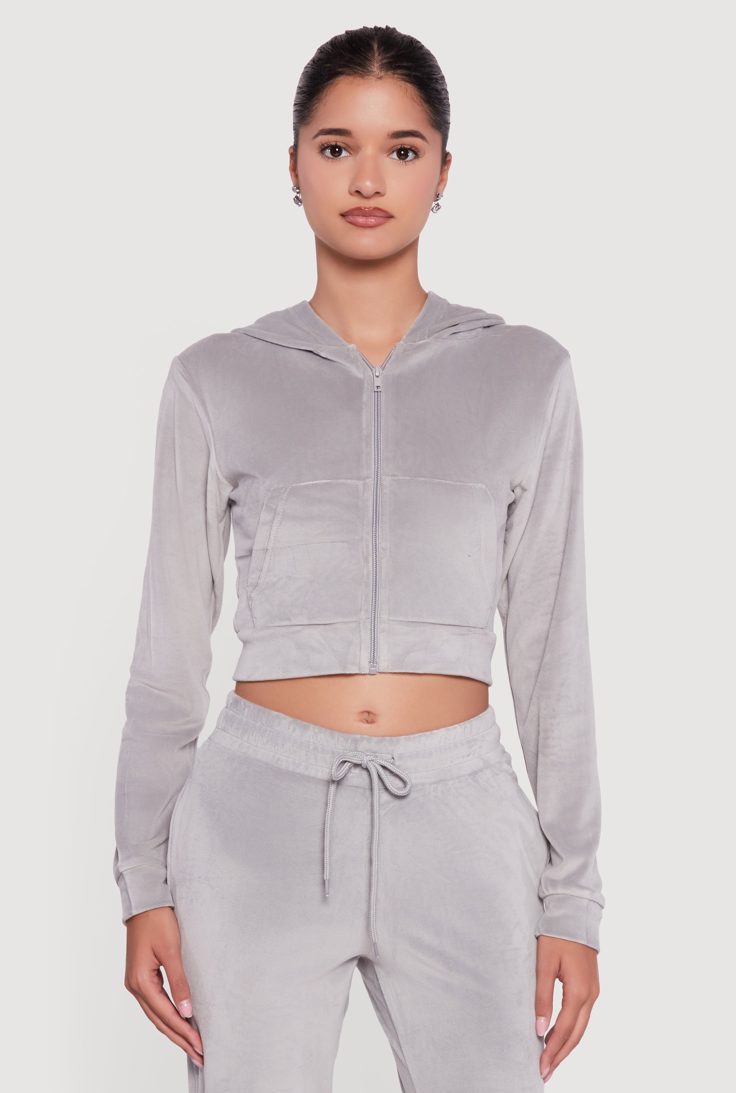 Velour Long Sleeve Cropped Zip Front Hoodie