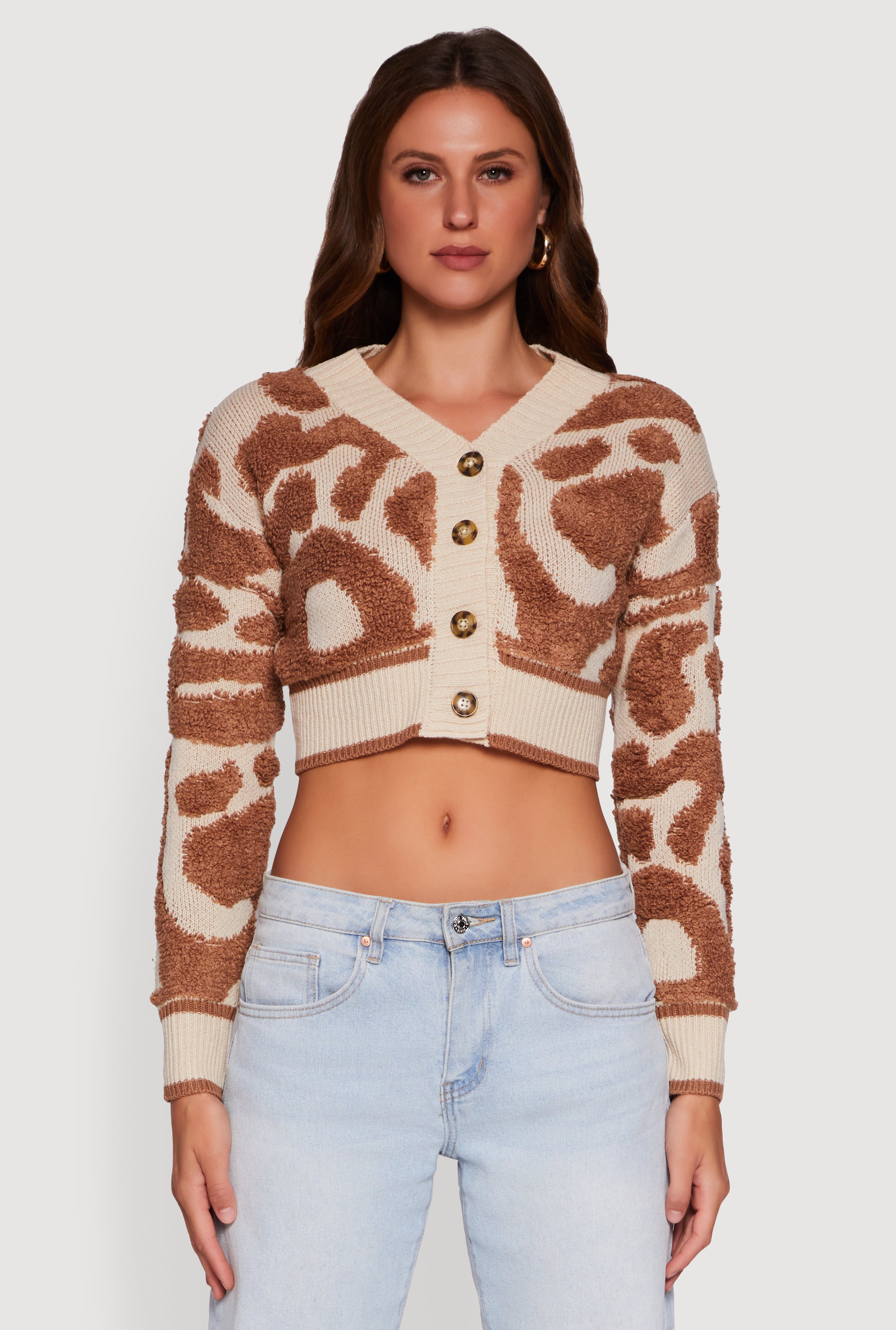 Swirl Print Boucle Cropped Button Front Cardigan