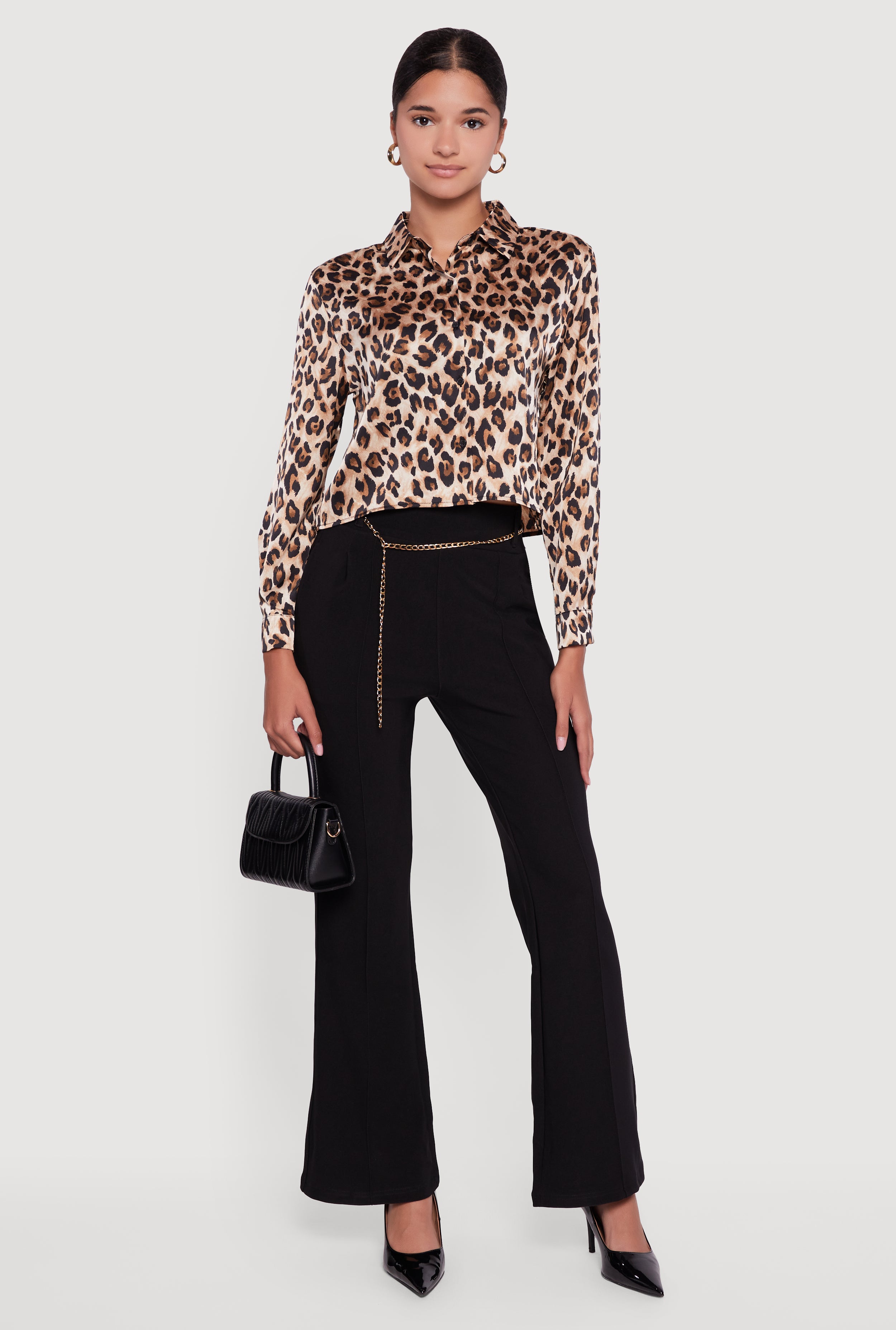 Leopard Print Satin Cropped Button Front Shirt