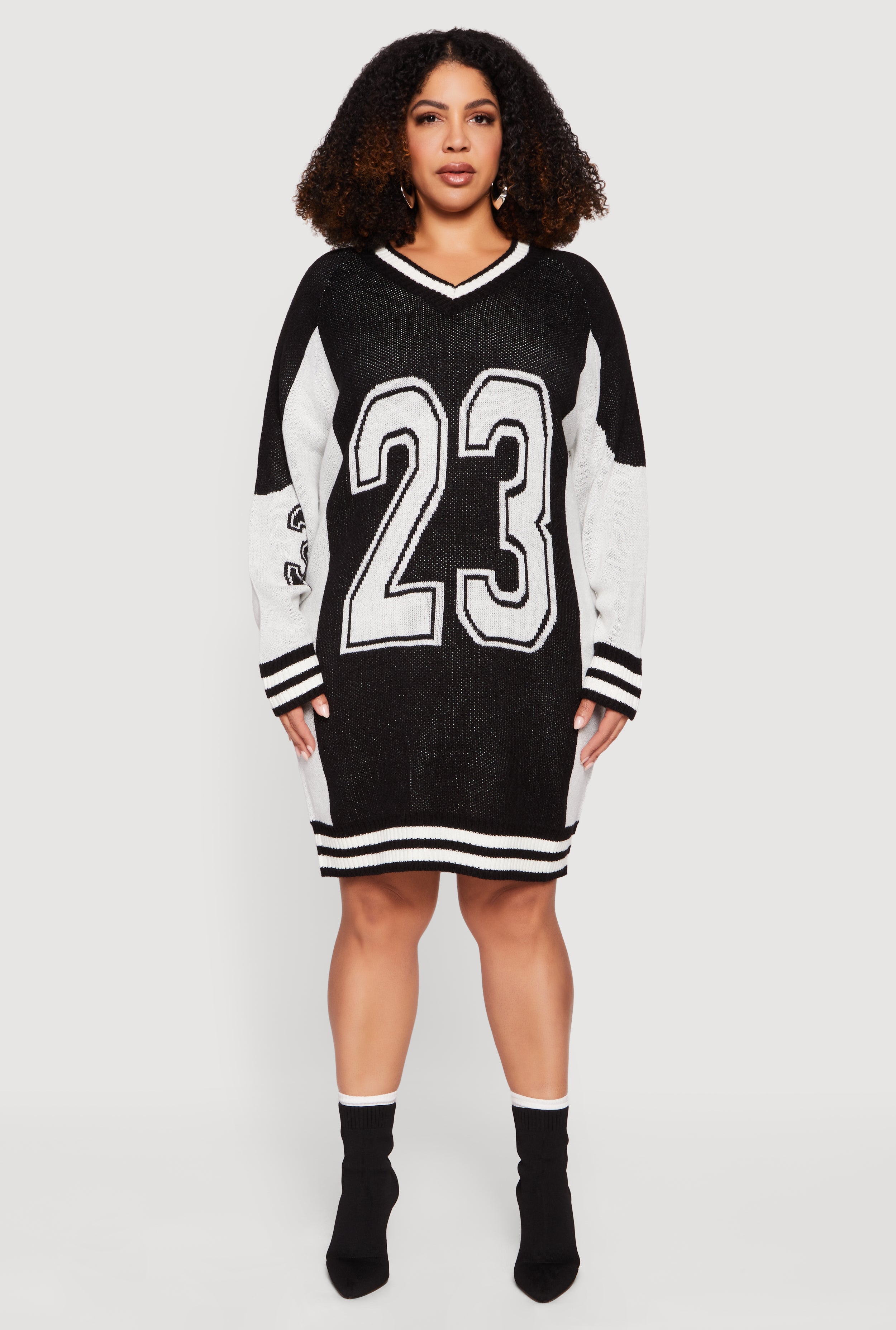 Step into effortless style with the Plus Size 23 Varsity Sweater Dress. This short-length dress features a relaxed fit and cozy long sleeves, perfect for those laid-back days when comfort meets cool. The sporty varsity graphic "23" and V-neckline add just the right amount of edge to your casual athleisure look. Whether you're heading back to school or just want to keep it chill, this sweater dress has got you covered.