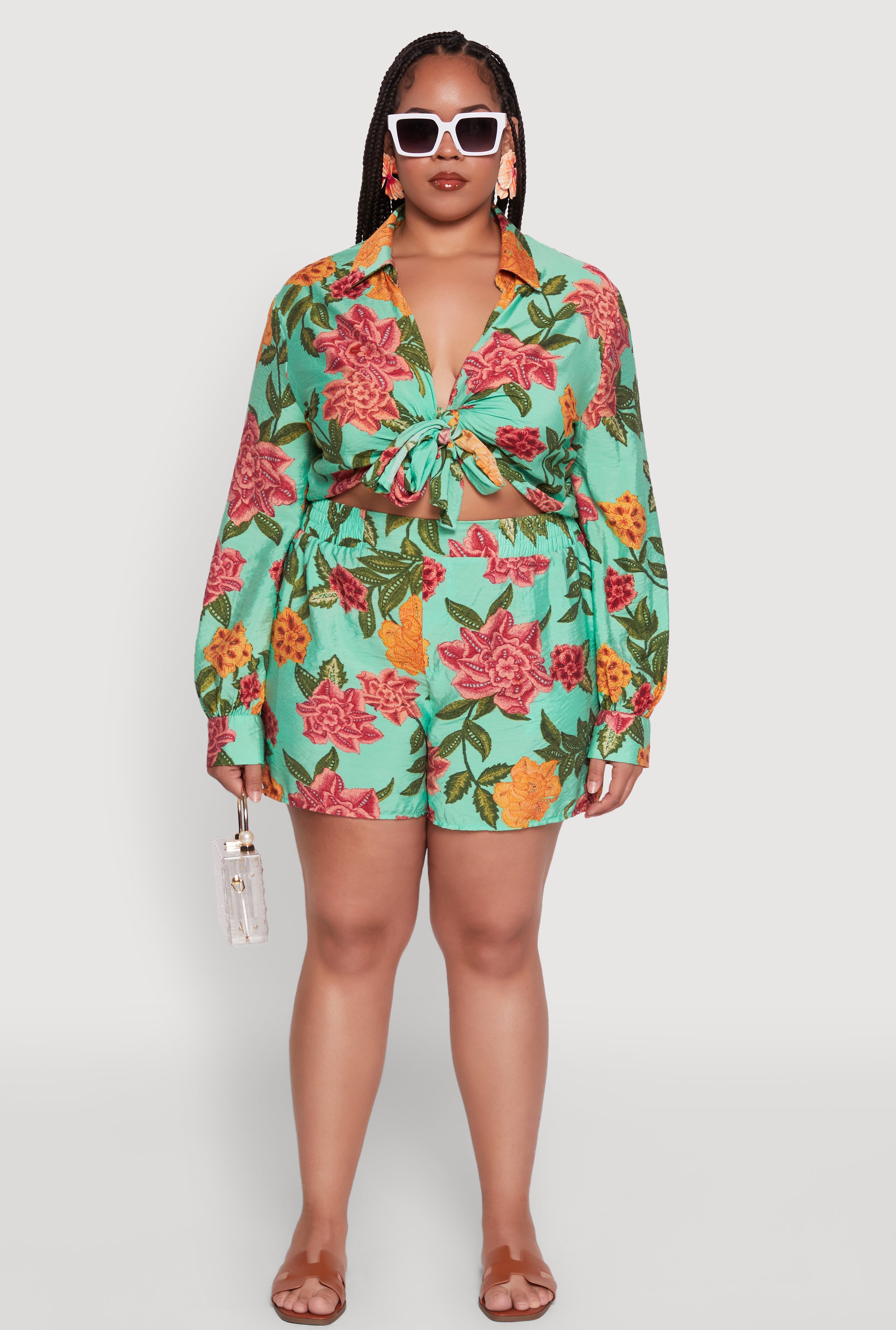 Step into summer with confidence and style in our Plus Size Floral High Waisted Pull On Shorts. Featuring a vibrant floral pattern and a comfy elastic waist, these shorts are your new go-to for effortless chic. Whether you're lounging or out and about, their high rise and soft crepe knit fabric keep you feeling cool and looking fabulous all day long.